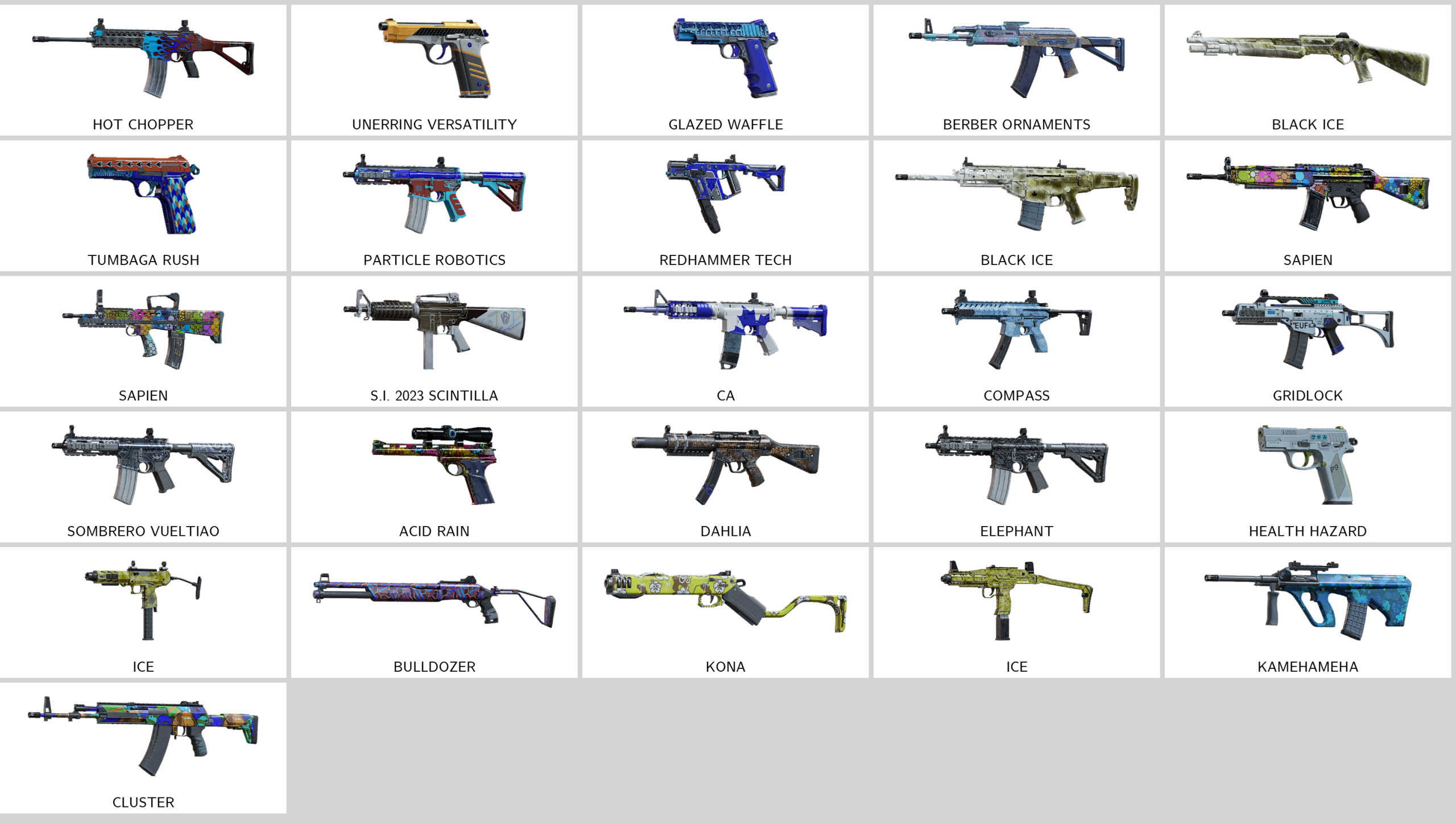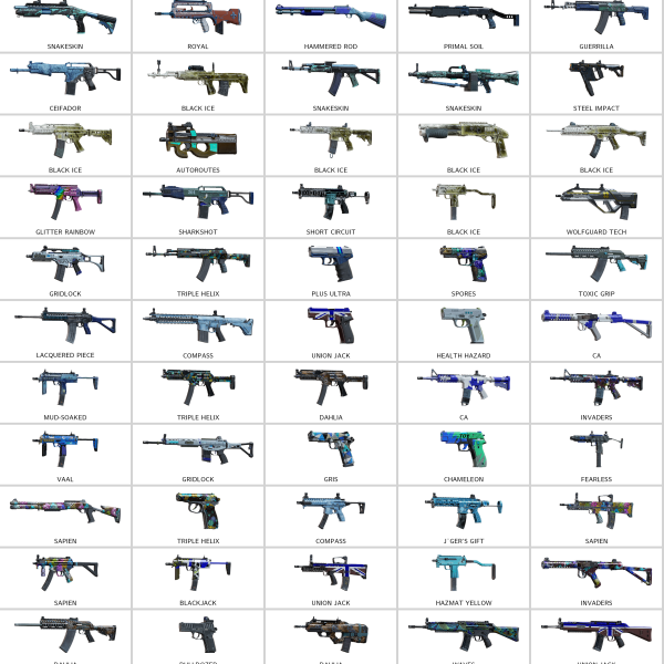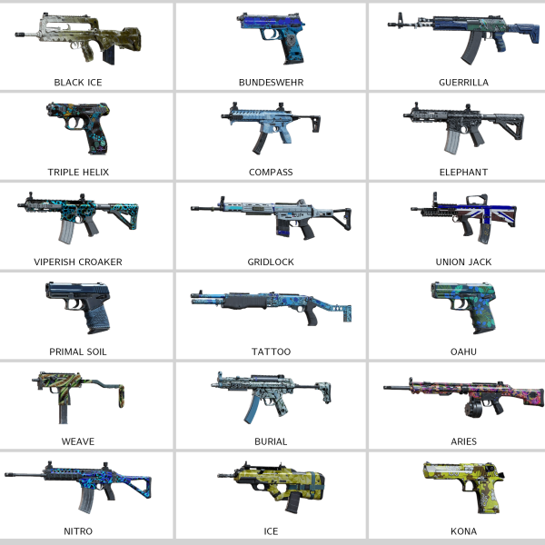 Some of Other Skins: Decals (417), Glory (UMP45), Wild Instinct (Supernova), Tumbaga Rush (Mk1 9mm), Health Hazard (P9), Gridlock (G36C), Acid Rain (GONNE-6), Compass (MPX)…