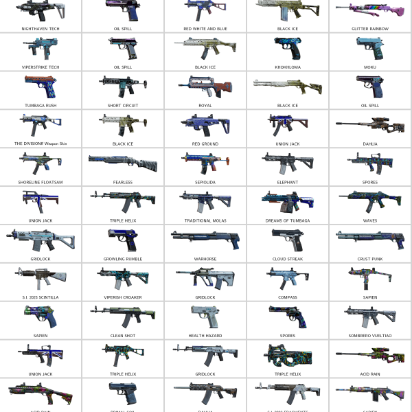 Some of Other Skins: Bundeswehr (P12), Fray Instrument (FMG-9), Target (R4C), Oil Spill (D-50), Wilderness Equipment (G8A1), Oil Spill (PMM), Fine Leather (LFP586), Glory (G36C)…
