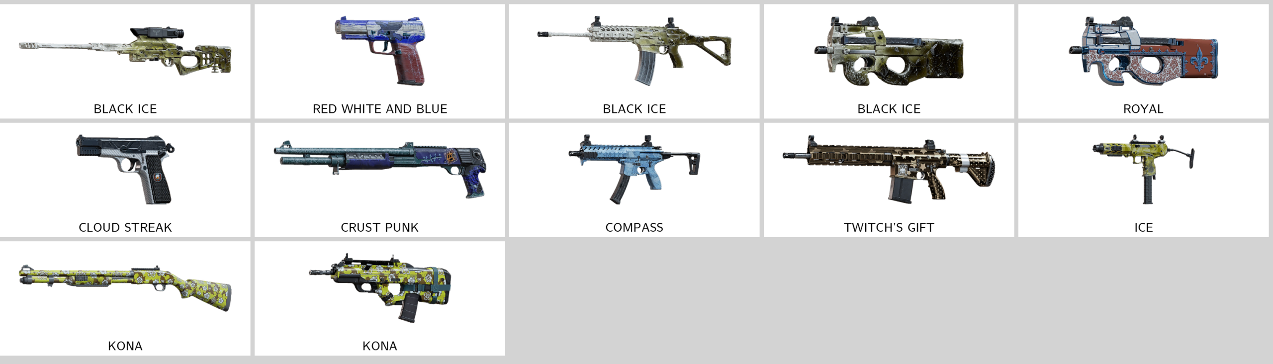 Some of Other Skins: Fray Instrument (FMG-9), Target (R4C), Leder (M870), Royal (P90), Red White And Blue (5.7 USG), Wild Instinct (P229), Bundeswehr (AUG A2), Leder (AUG A2)…
