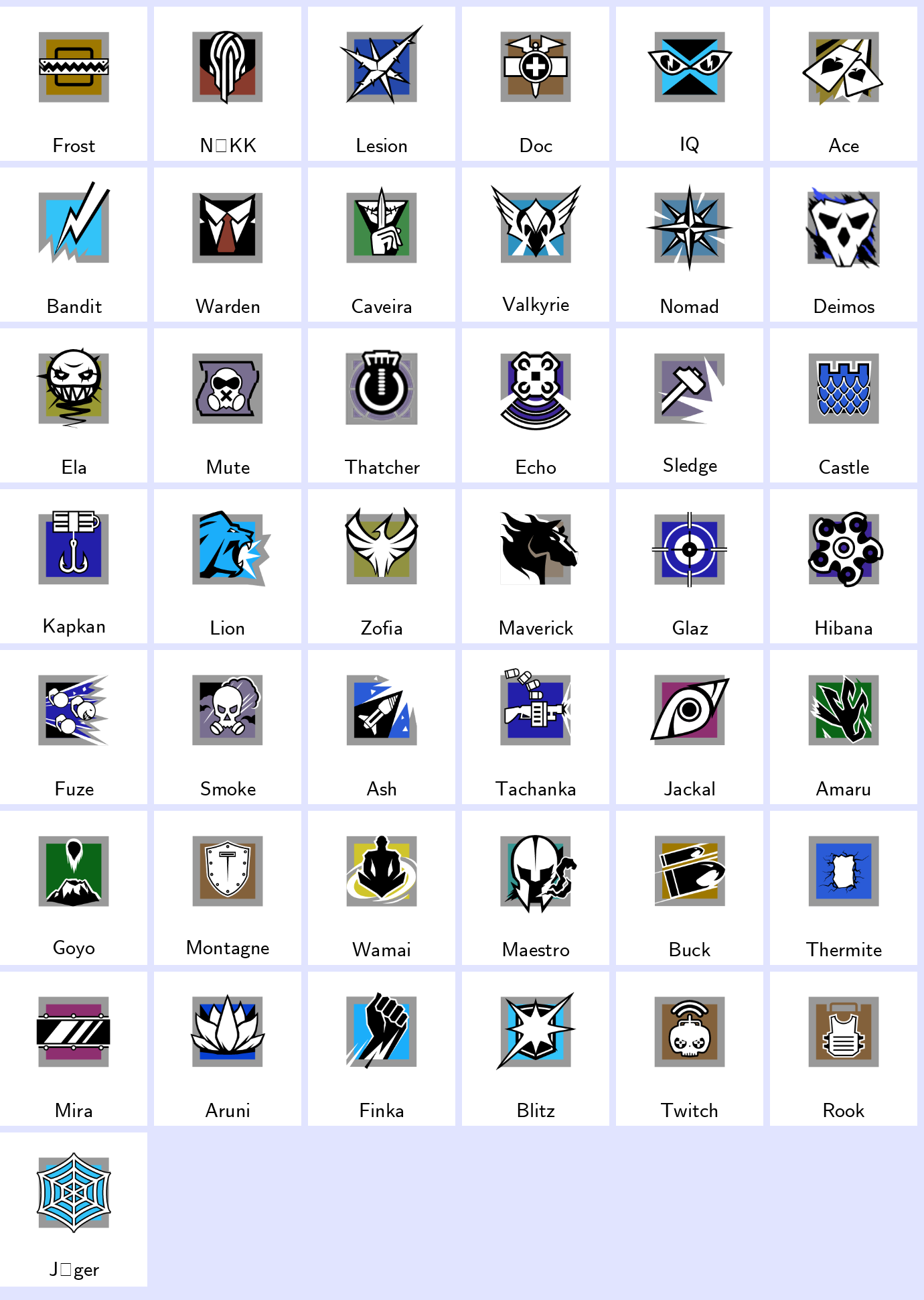 Some Operators: Frost, Nokk, Lesion, Doc, Iq, Ace, Bandit, Warden, Caveira, Valkyrie…