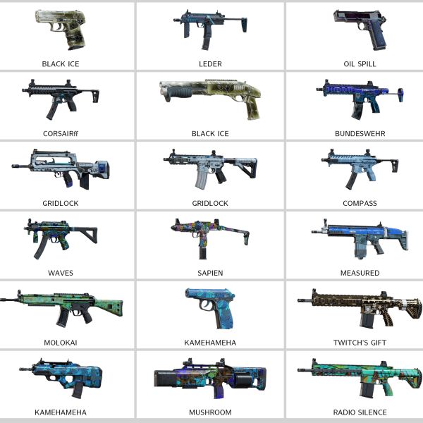 – Ethereal Marksman (416-C), Urban Graffiti (Type-89), Stone Talon (T-5 SMG), Viral Douser (F2), Riveted Scraps (P90), Tranquil Ambush (M4)