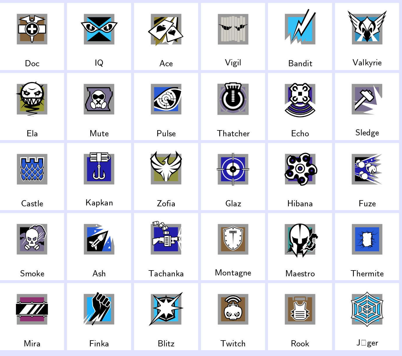 Some Operators: Doc, Iq, Ace, Vigil, Bandit, Valkyrie, Ela, Mute, Pulse, Thatcher…
