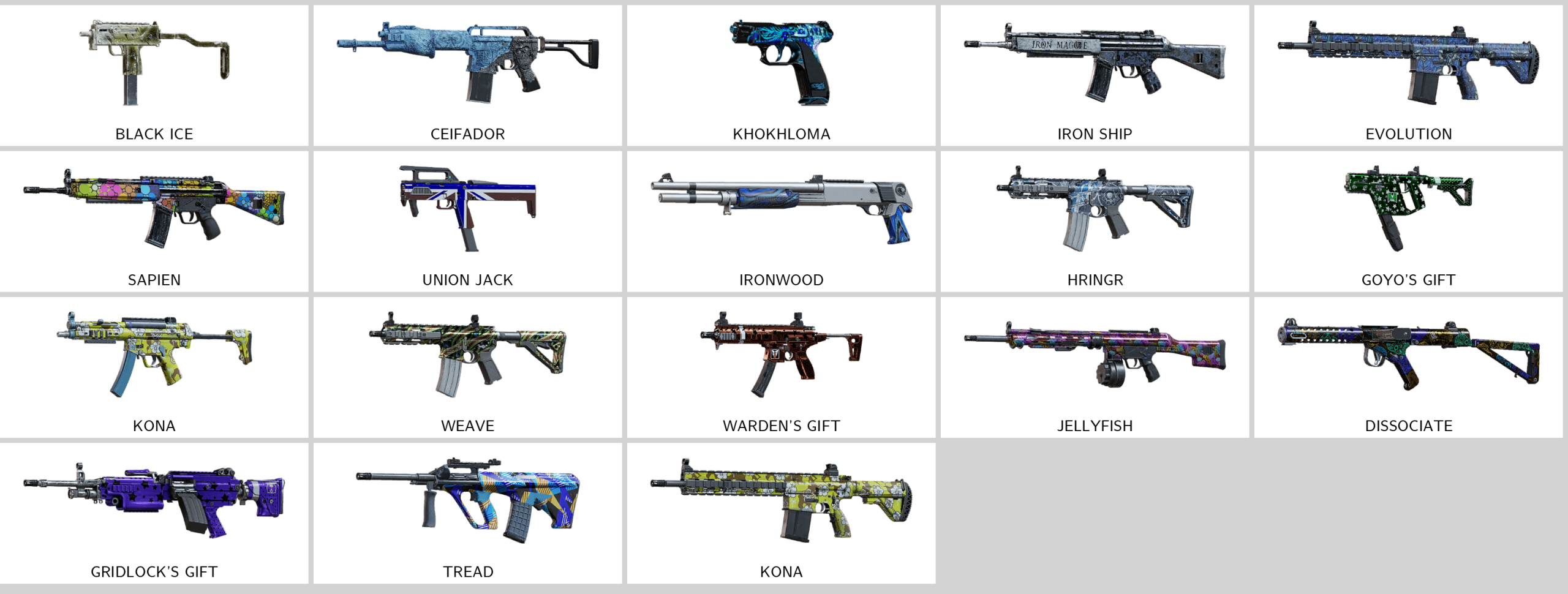 Some of Other Skins: Ceifador (SPAS-15), Glory (556XI), Sturdy (C8-SFW), Leder (P12), Khokhloma (GSH-18), Iron Ship (AR33), Ironwood (Super 90), Mimesis Violet (Scorpion)…