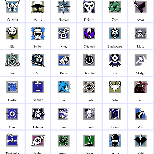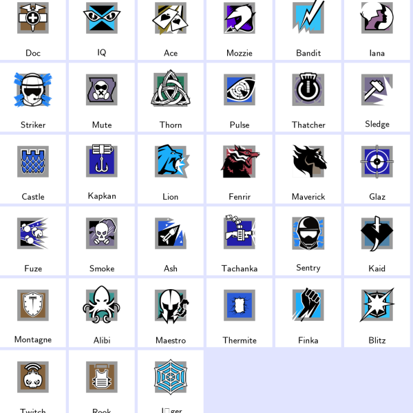 Some Operators: Frost, Lesion, Doc, Iq, Thunderbird, Ace, Vigil, Mozzie, Dokkaebi, Bandit…