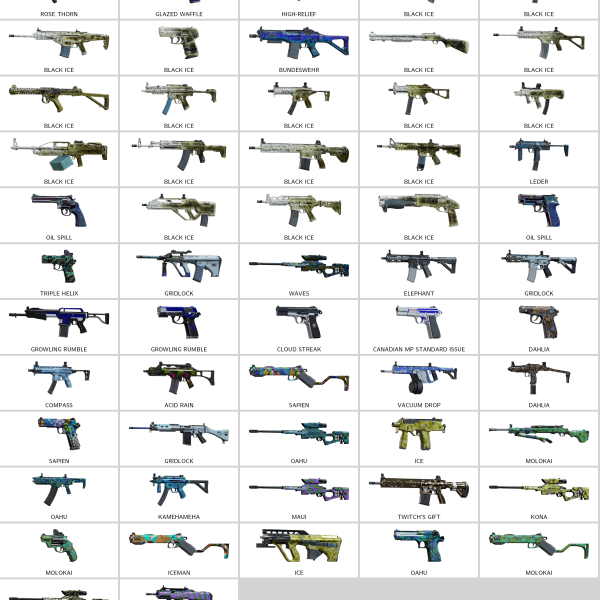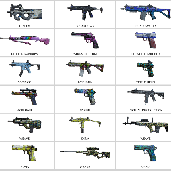 Some of Other Skins: Warning Bite (AR-15), Bygone Remnant (417), Target (R4C), Cloud Streak (G36C), Glory (5.7 USG), Datum Processor (M590A1), Oil Spill (5.7 USG), Pearl (Mk1 9mm)…