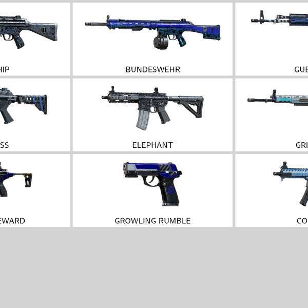 – Comic Strip (P10 Roni), Golden Repair (Mk 14 EBR), Moon Howlings (SC3000K), Riveted Scraps (P90)