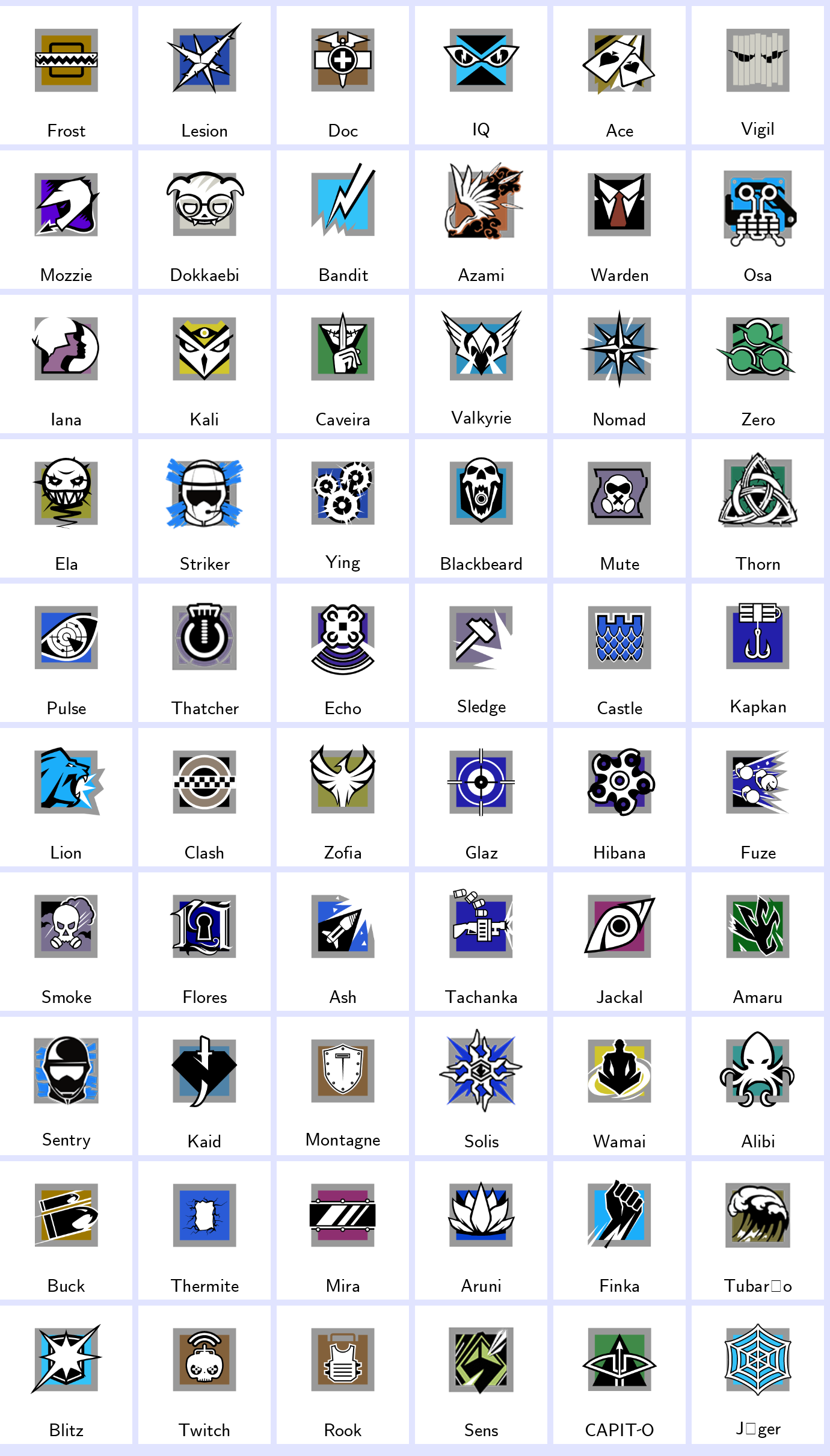 Some Operators: Frost, Lesion, Doc, Iq, Ace, Vigil, Mozzie, Dokkaebi, Bandit, Azami…