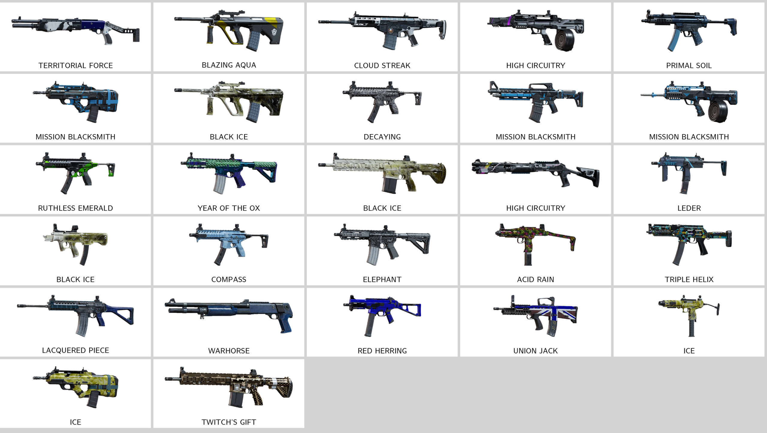 – Subatomic Beam (PDW9), Arctic Range (C8-SFW), Ferrum (M590A1), Coffee Stain (F90), Ferrum (L85A2), The Old Stock (L85A2)…