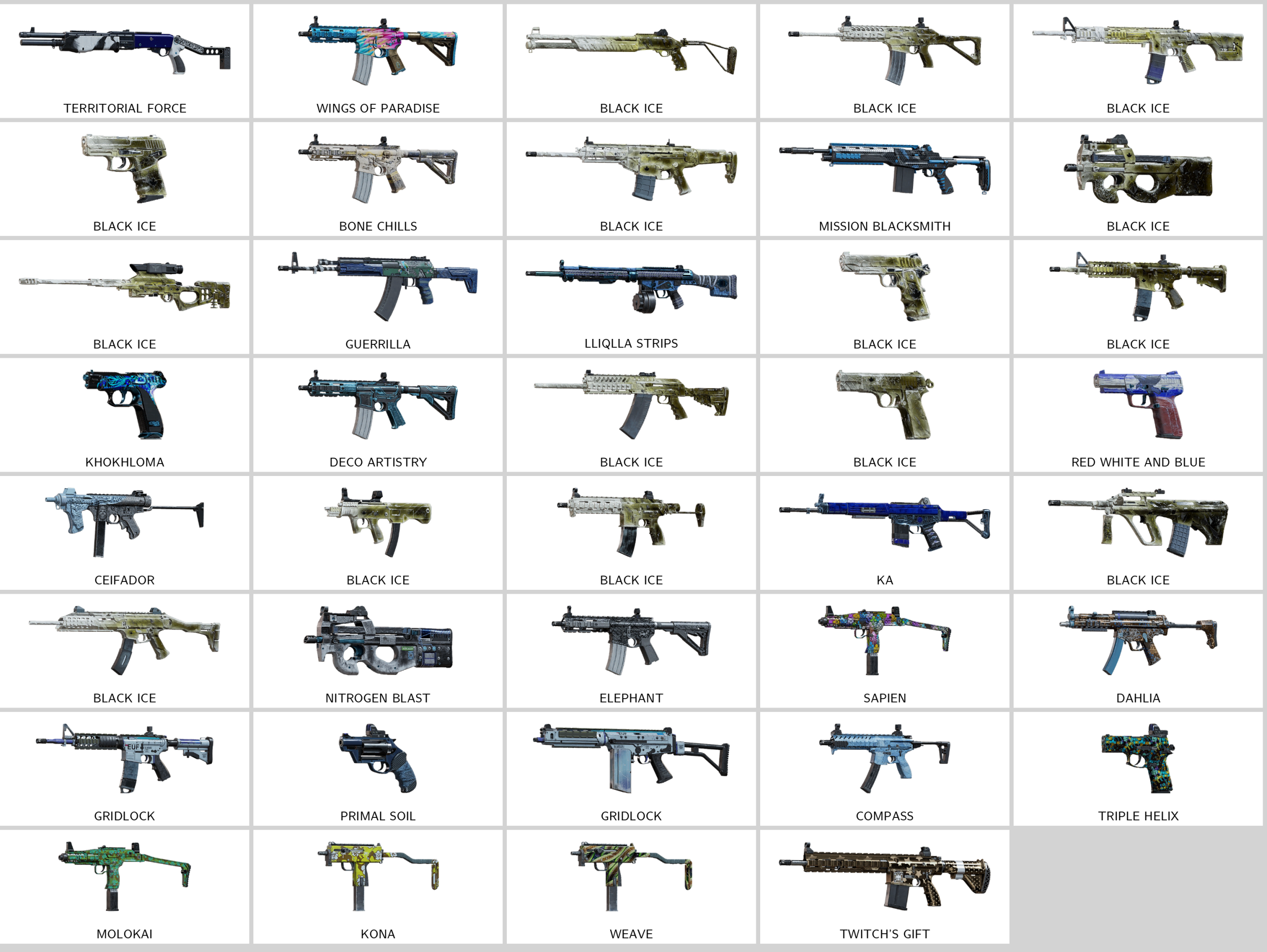 – Subatomic Beam (PDW9), Ethereal Marksman (416-C), Subatomic Beam (556XI), The Old Stock (L85A2), Scavenged Wonder (CAMRS), Territorial Force (SPAS-12)…
