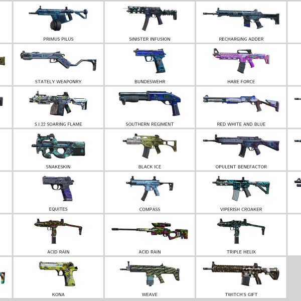 Some of Other Skins: Target (R4C), Wild Instinct (TCSG12), Peril Control (T-5 SMG), Scaled Kiss (R4C), Oil Spill (5.7 USG), Nighthaven MK0 (AK12), Exoskeleton (Vector), Quincunx (556XI)…