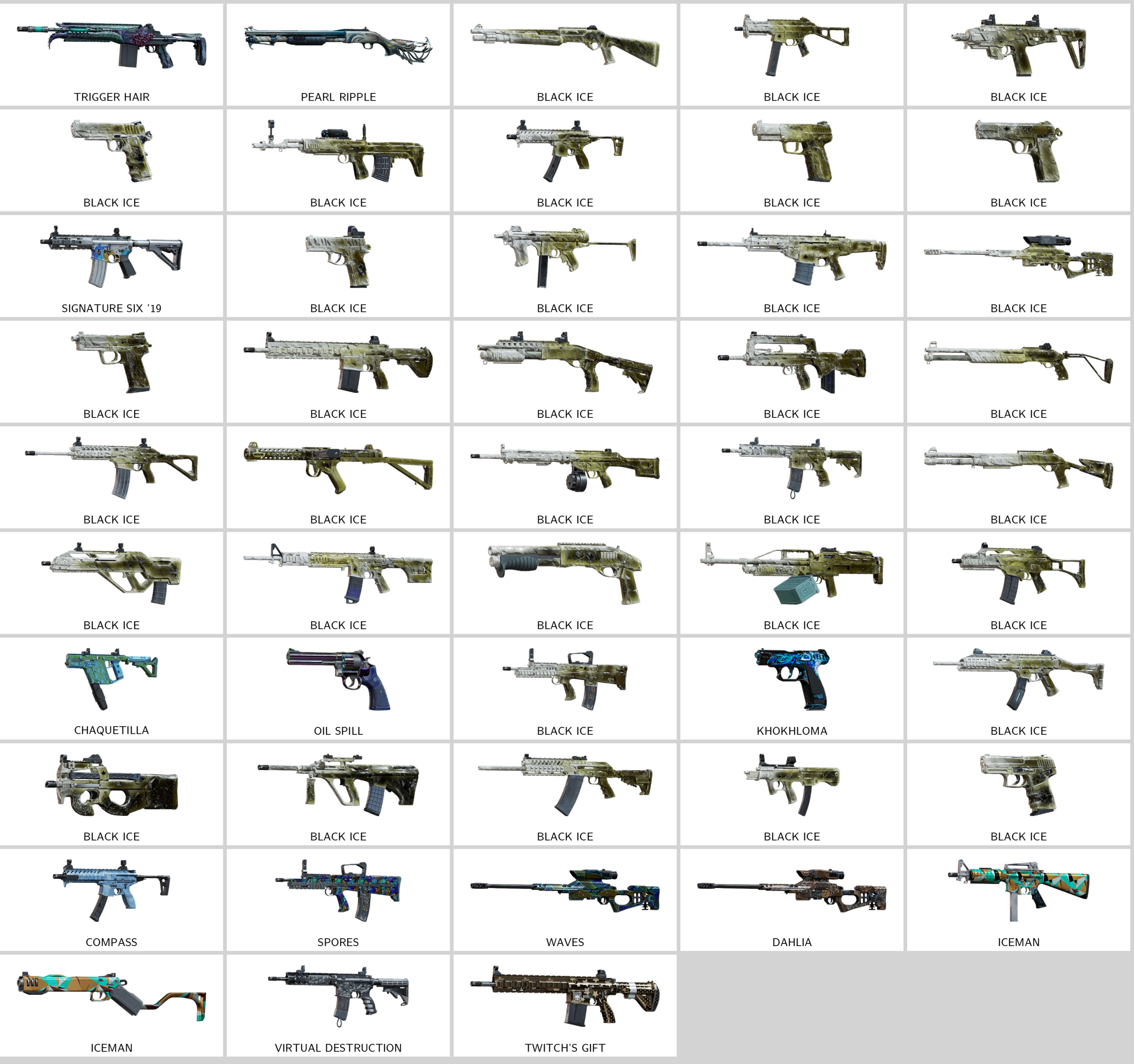 – Mythical Majesty (AK-74M), Gritty (ITA12S), Modern Gleam (SASG-12), SWAT Flag (UMP45), Military Tarp (AUG A3), Pearl Ripple (M590A1)
