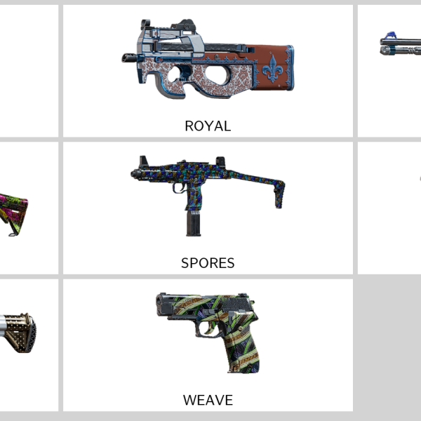 Some of Other Skins: Decals (417), Moku (P229), Snakeskin (ALDA 5.56), Opulent Benefactor (AR33), Oil Spill (Mk1 9mm), Bomberos (ITA12L), Spores (R4C), Vaal (MP7)…