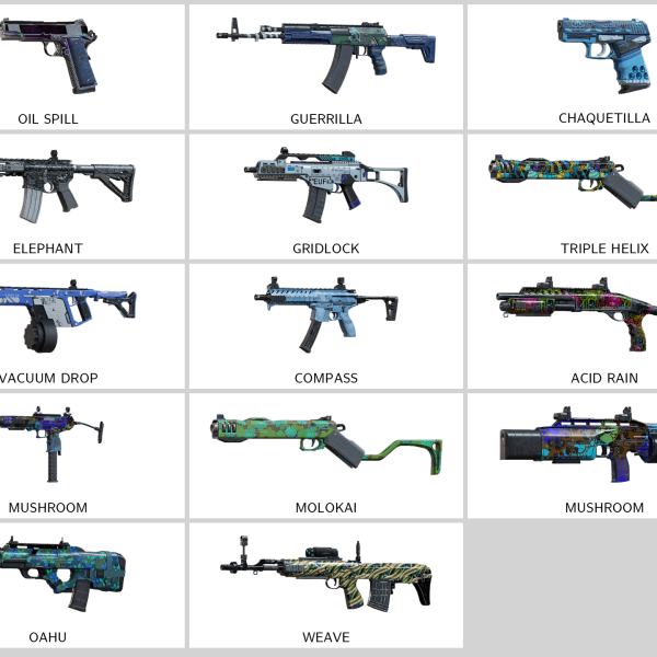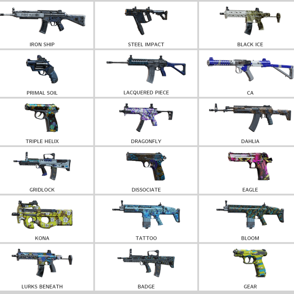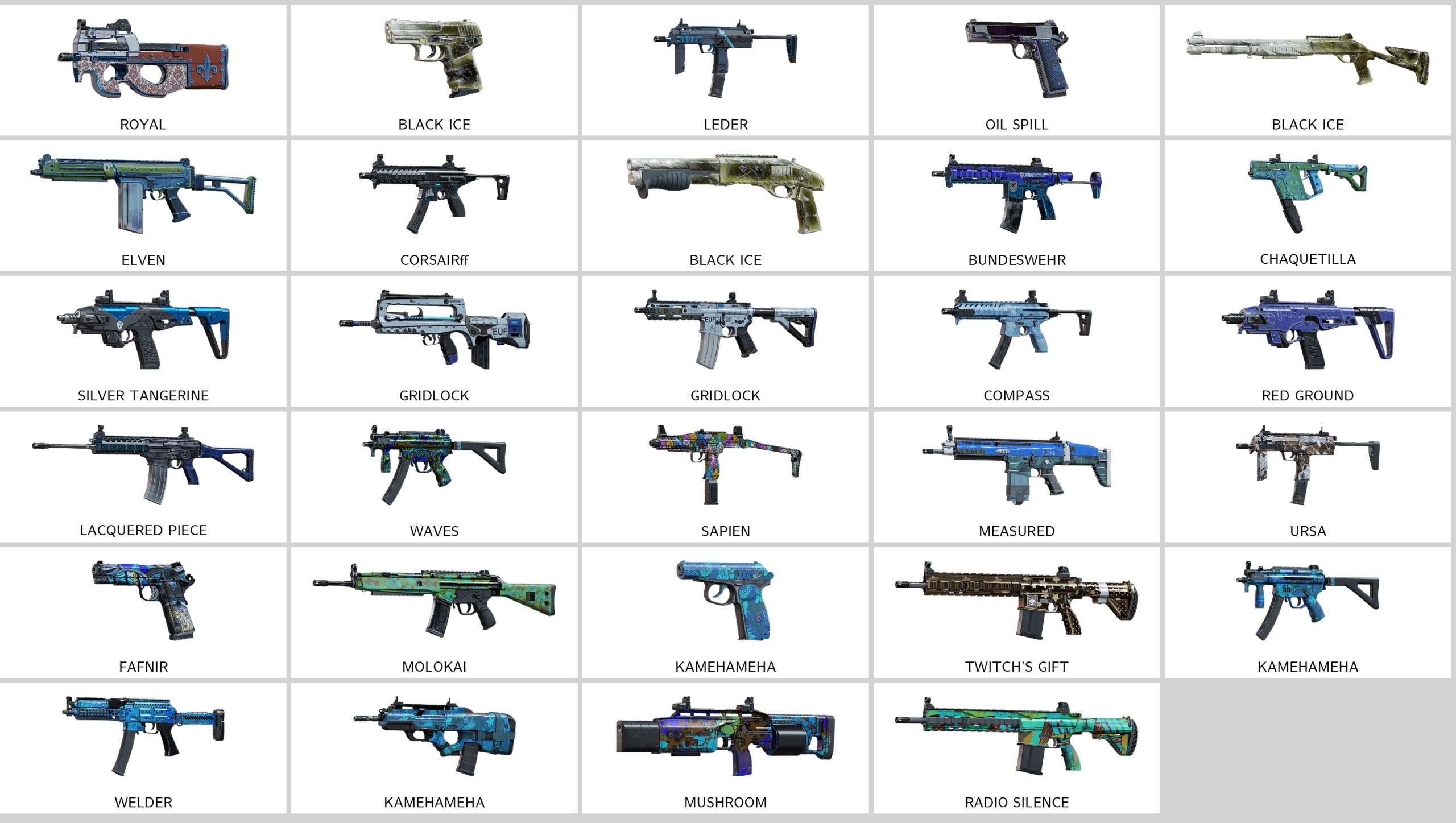 Some of Other Skins: Takka (MPX), Target (R4C), Royal (P90), Bundeswehr (416-C), Silver Tangerine (P10 Roni), Elven (PARA-308), Trek (PMM), Trafalgar (SMG-11)…