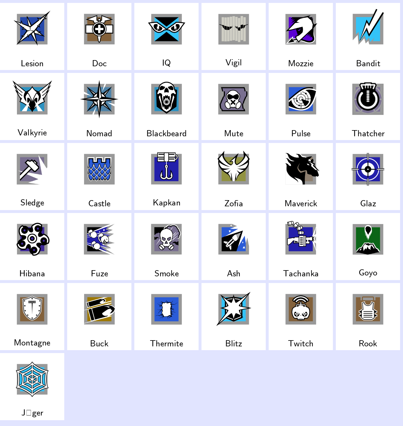 Some Operators: Lesion, Doc, Iq, Vigil, Mozzie, Bandit, Valkyrie, Nomad, Blackbeard, Mute…