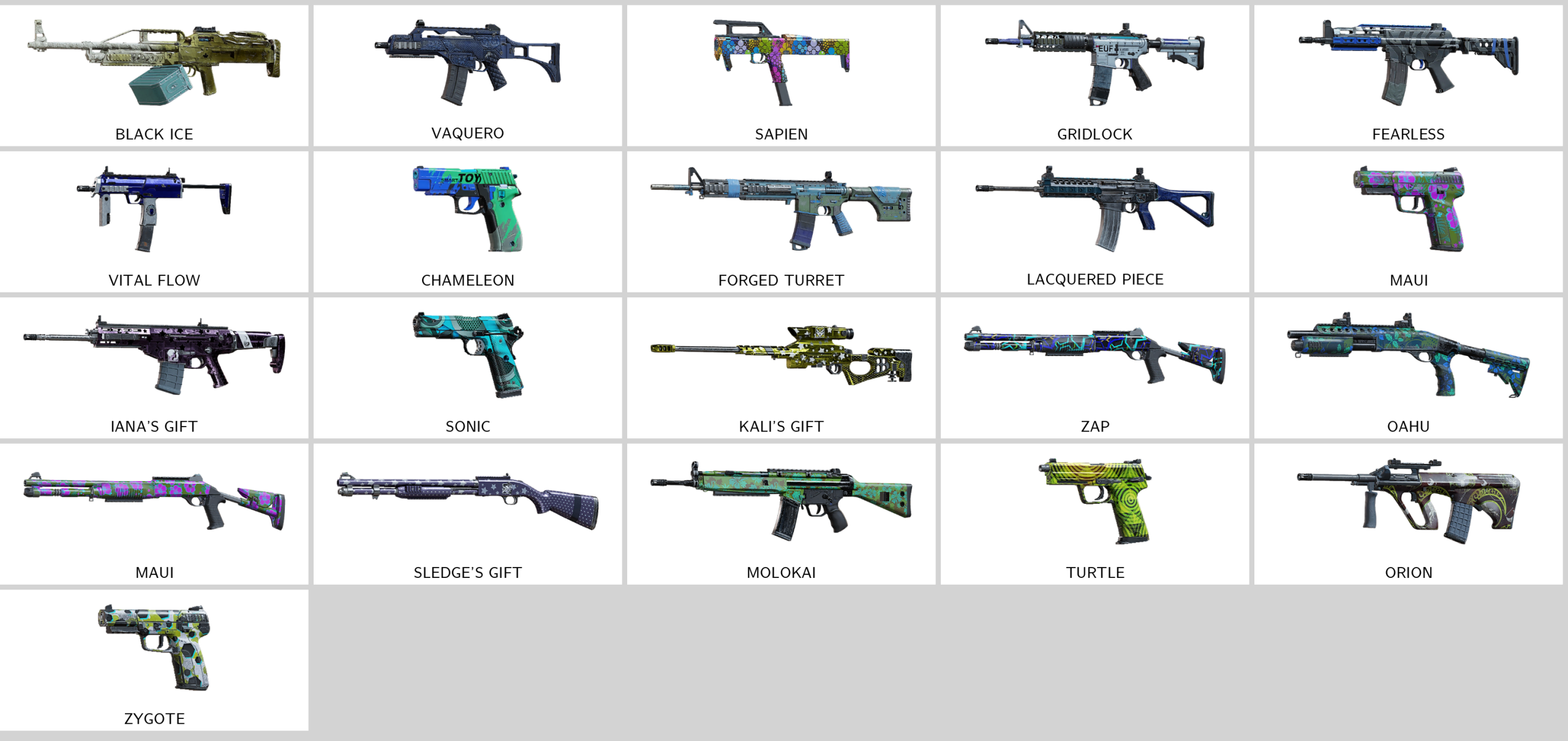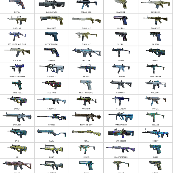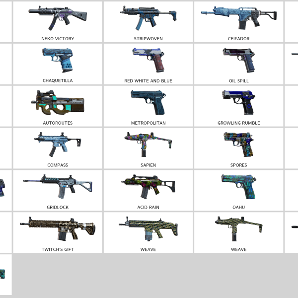 Some of Other Skins: Vaquero (G36C), Trafalgar (SMG-11), Spores (R4C), Brasil (M12), Chameleon (P226), Lacquered Piece (556XI), Charred (556XI), Faded (5.7 USG)…