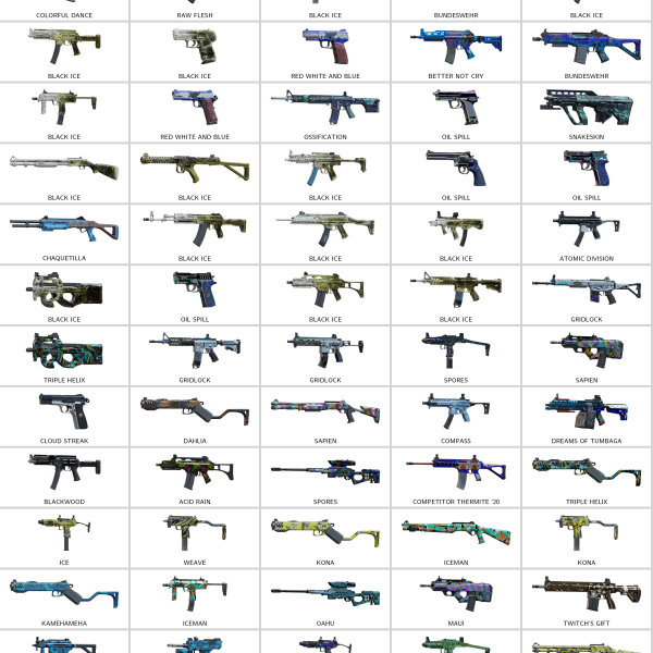 Some of Other Skins: Deliverance (SPAS-12), Bundeswehr (MP7), High Circuitry (T-95 LSW), Target (R4C), Hive Mind (ARX200), Leder (M870), Red White And Blue (UMP45), Oil Spill (5.7 USG)…