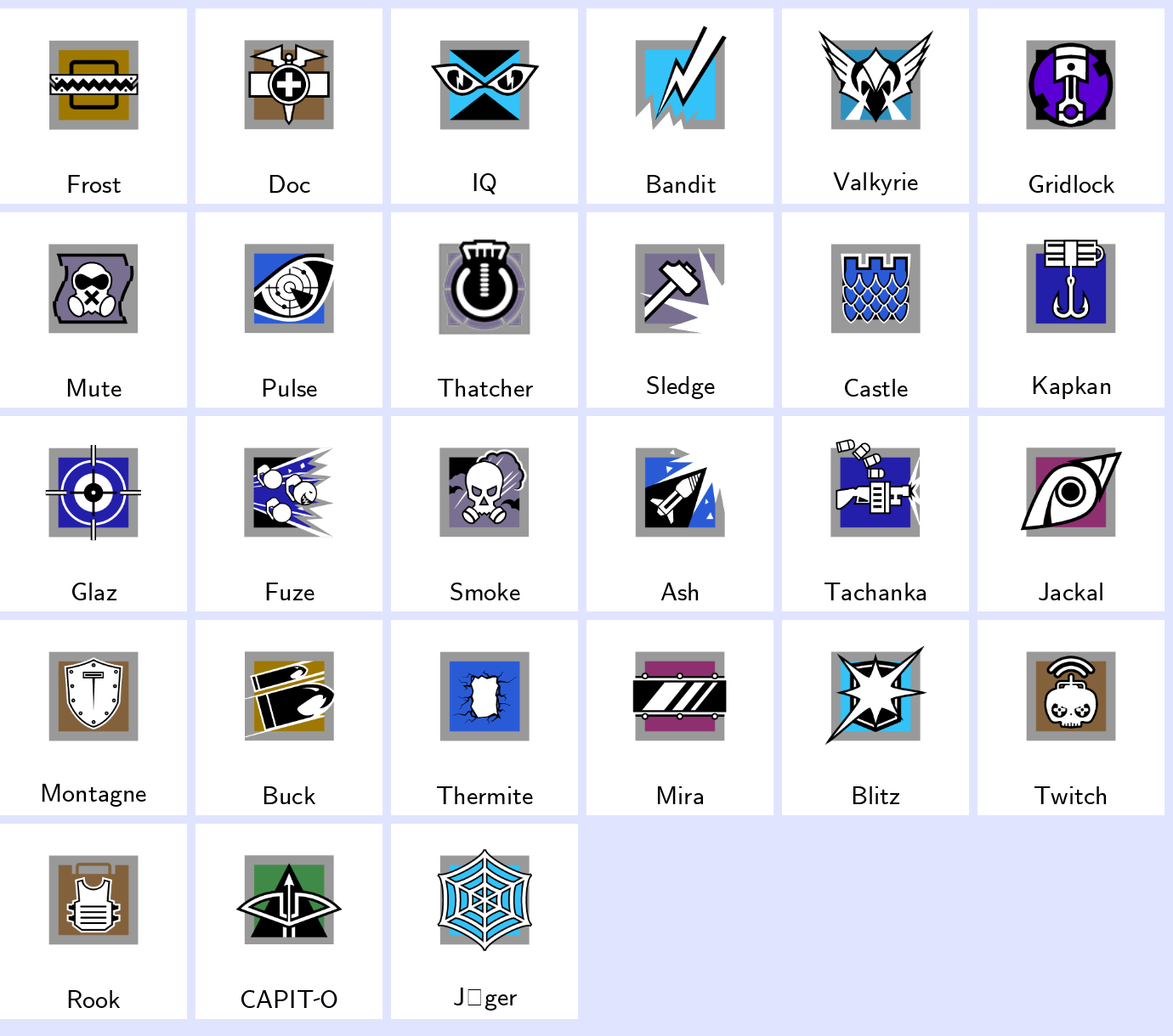 Some Operators: Frost, Doc, Iq, Bandit, Valkyrie, Gridlock, Mute, Pulse, Thatcher, Sledge…