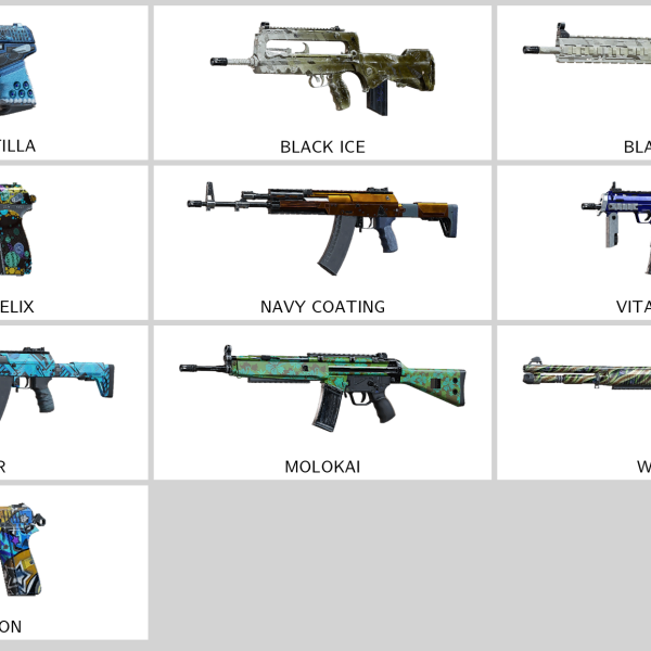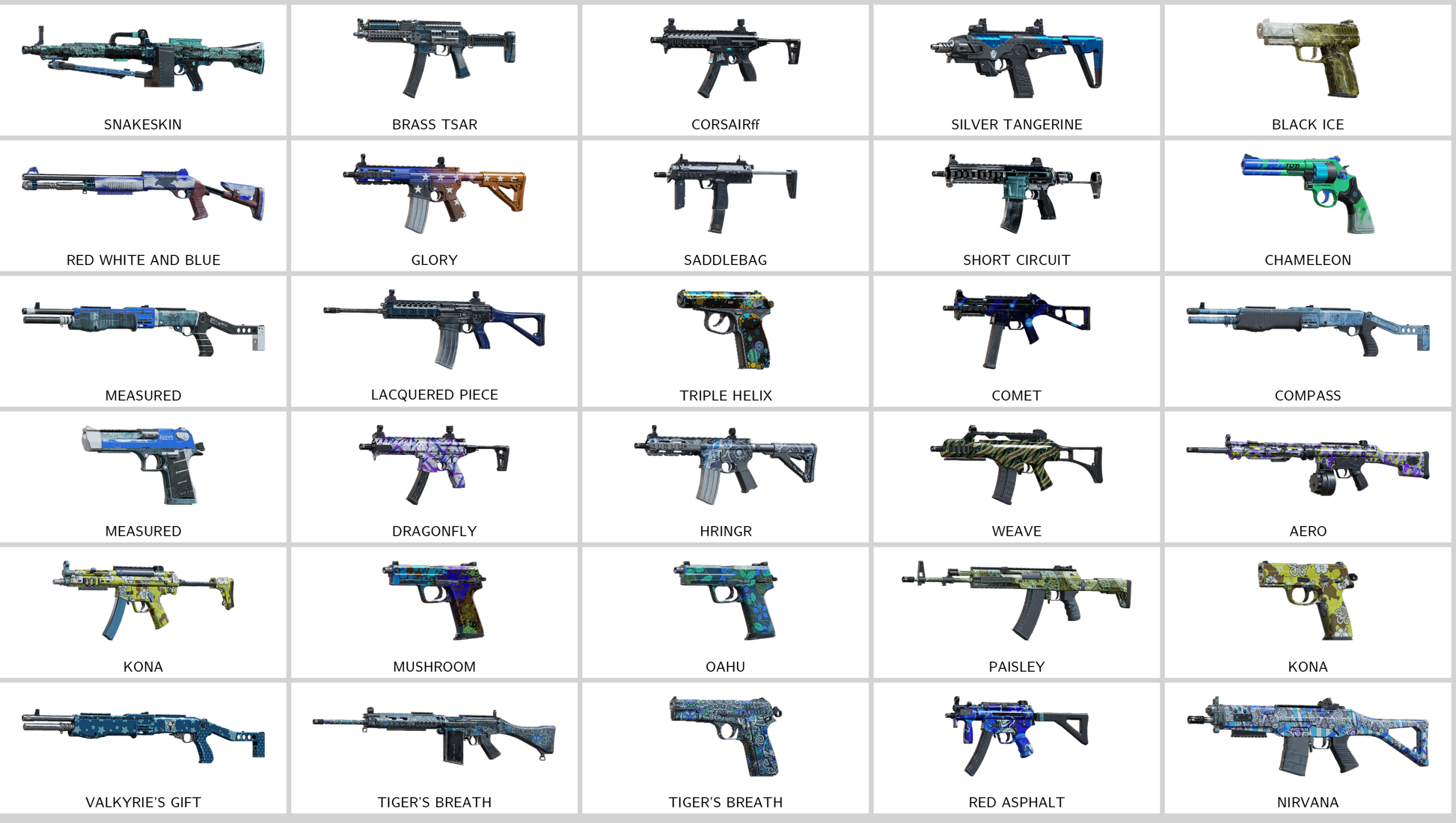 Some of Other Skins: Silver Tangerine (P10 Roni), Short Circuit (416-C), Snakeskin (ALDA 5.56), Khokhloma (PMM), Brass Tsar (9x19VSN), Khokhloma (OTs-03), Bundeswehr (AUG A2), Red White And Blue (M1014)…