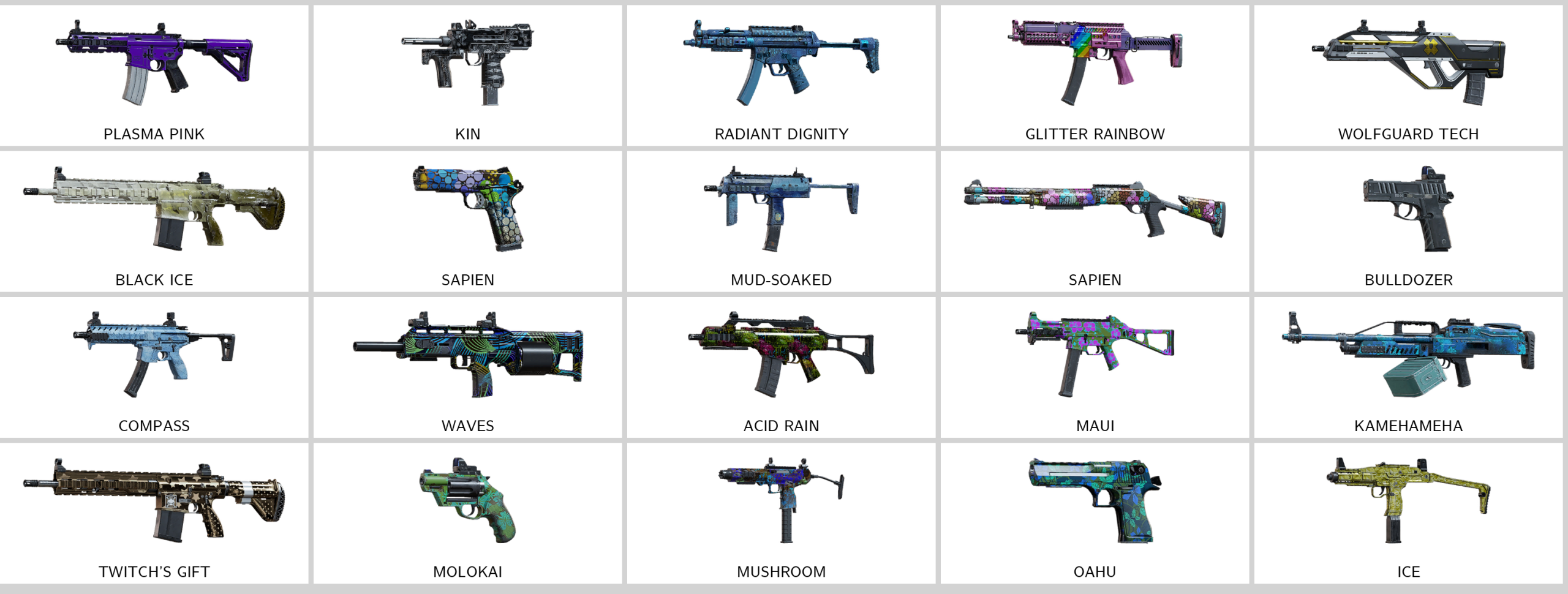 Some of Other Skins: Target (R4C), Wolfguard Tech (Spear), Venetian Posh (Keratos), Radiant Dignity (MP5), Kin (Bearing-9), Compass (MPX), Sapien (M1014), Mud-soaked (MP7)…