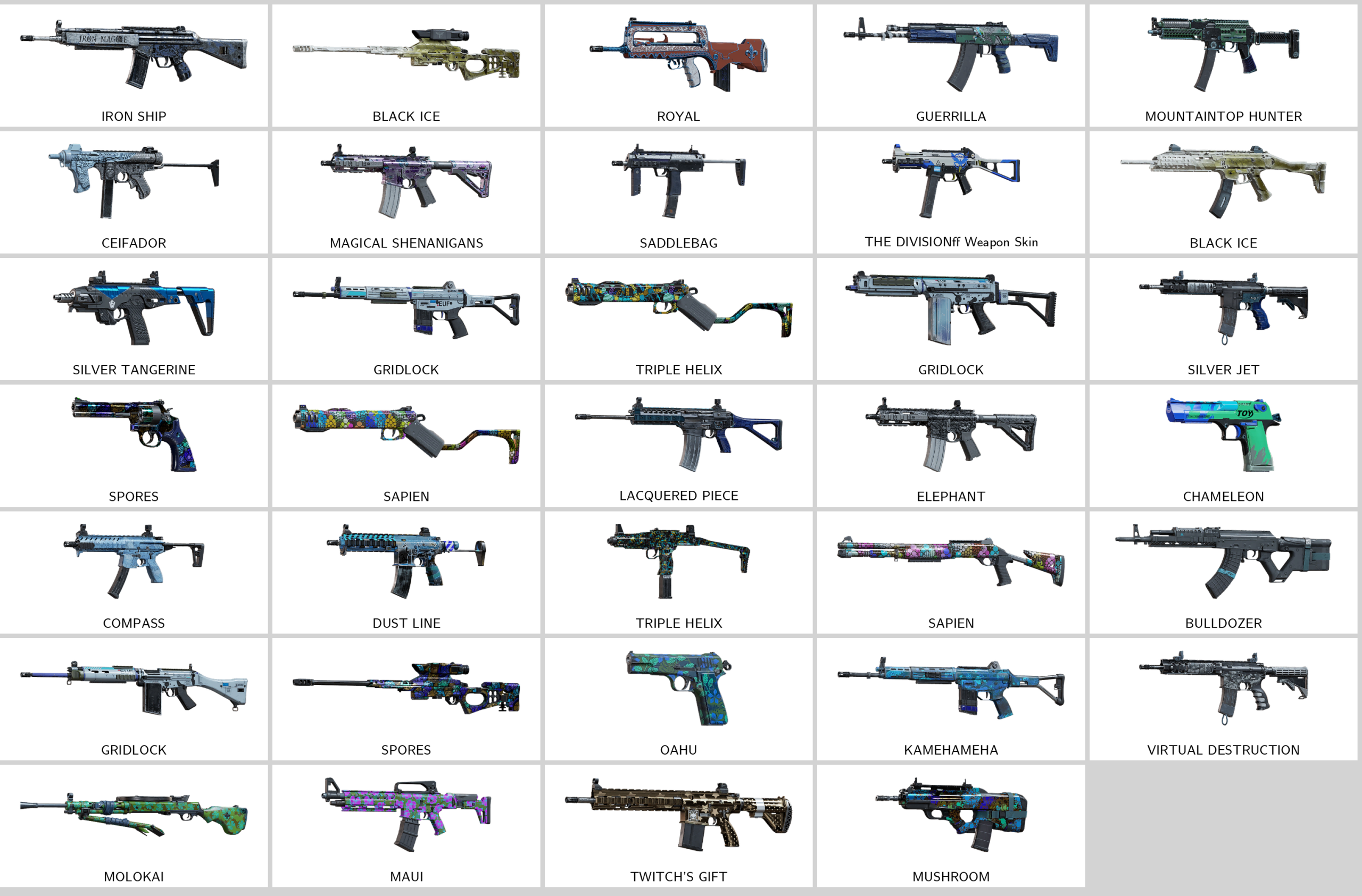 – The Old Stock (L85A2), Scavenged Wonder (CAMRS), Gritty (ITA12S), Mainframe (Vector), Riveted Scraps (P90)