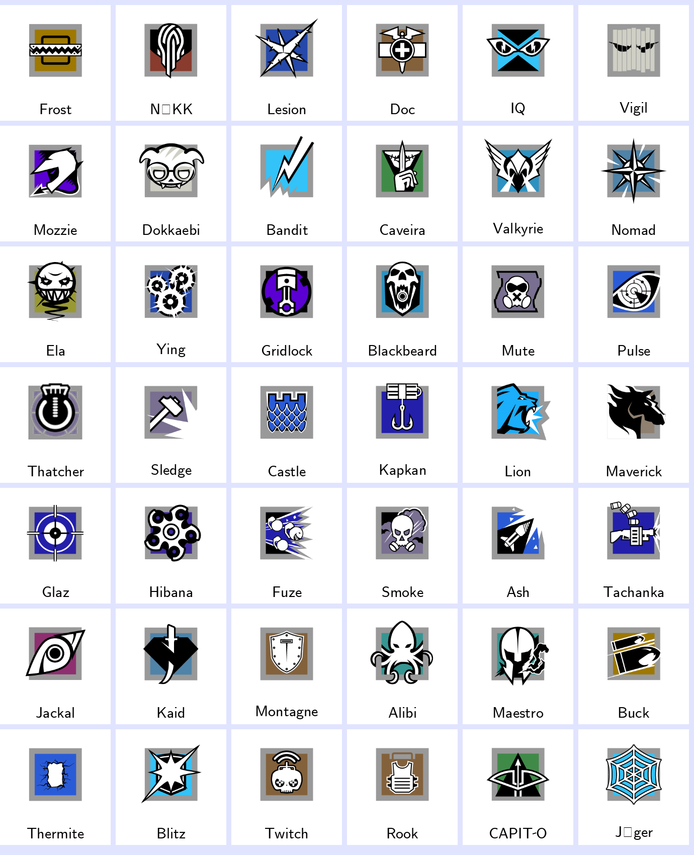 Some Operators: Frost, Nokk, Lesion, Doc, Iq, Vigil, Mozzie, Dokkaebi, Bandit, Caveira…