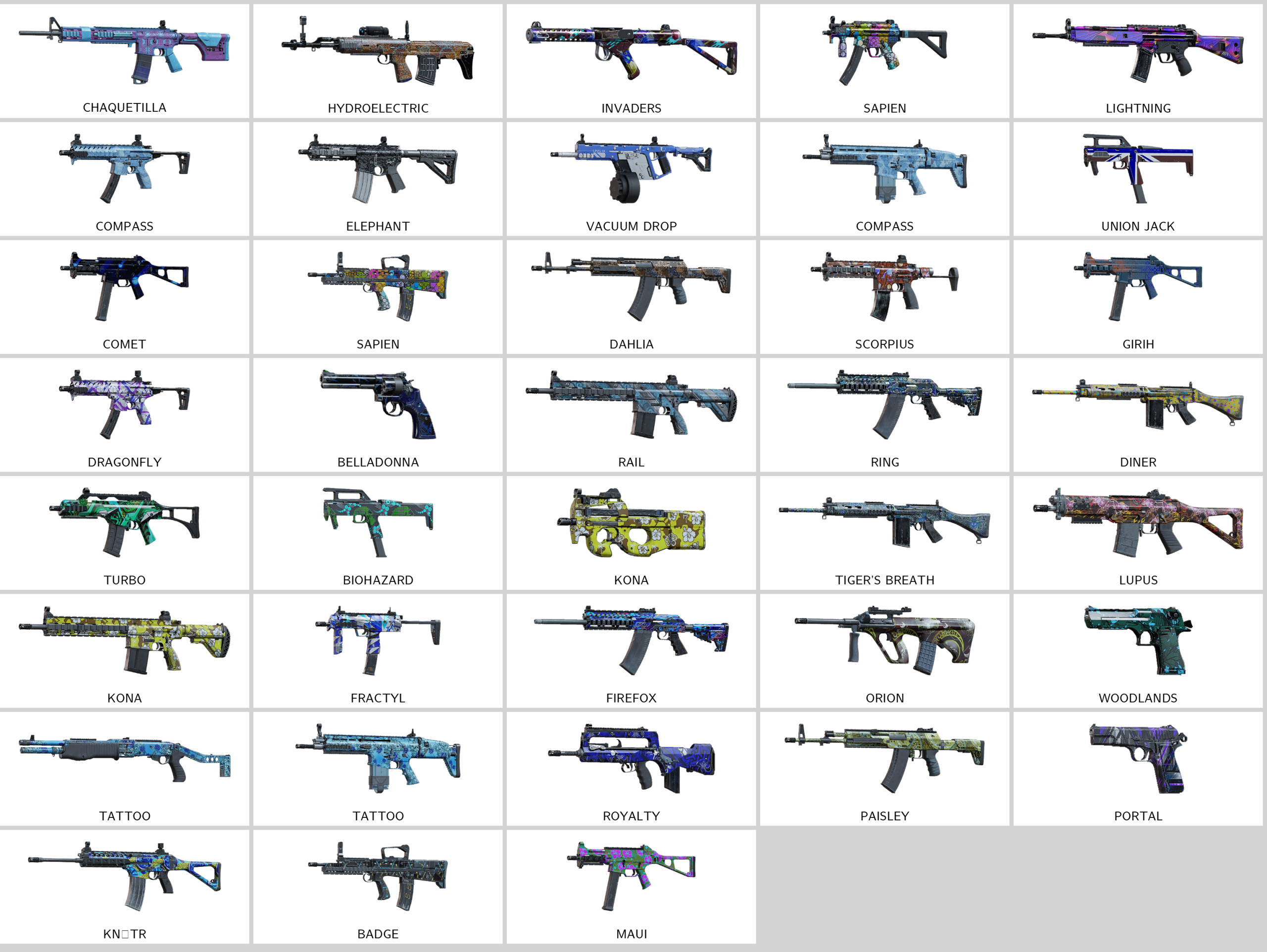 Some of Other Skins: Decals (417), Chaquetilla (C7E), Khokhloma (9x19VSN), Clockwork (FMG-9), Spores (R4C), Brasil (PARA-308), Snapping Twig (AR-15), Hydroelectric (OTs-03)…