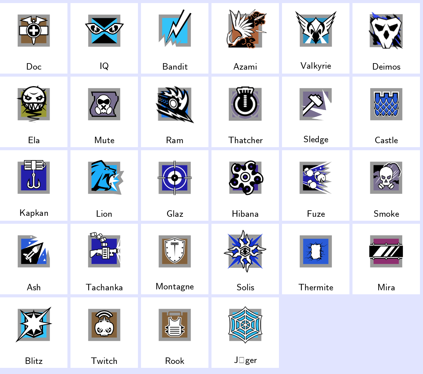 Some Operators: Doc, Iq, Bandit, Azami, Valkyrie, Deimos, Ela, Mute, Ram, Thatcher…