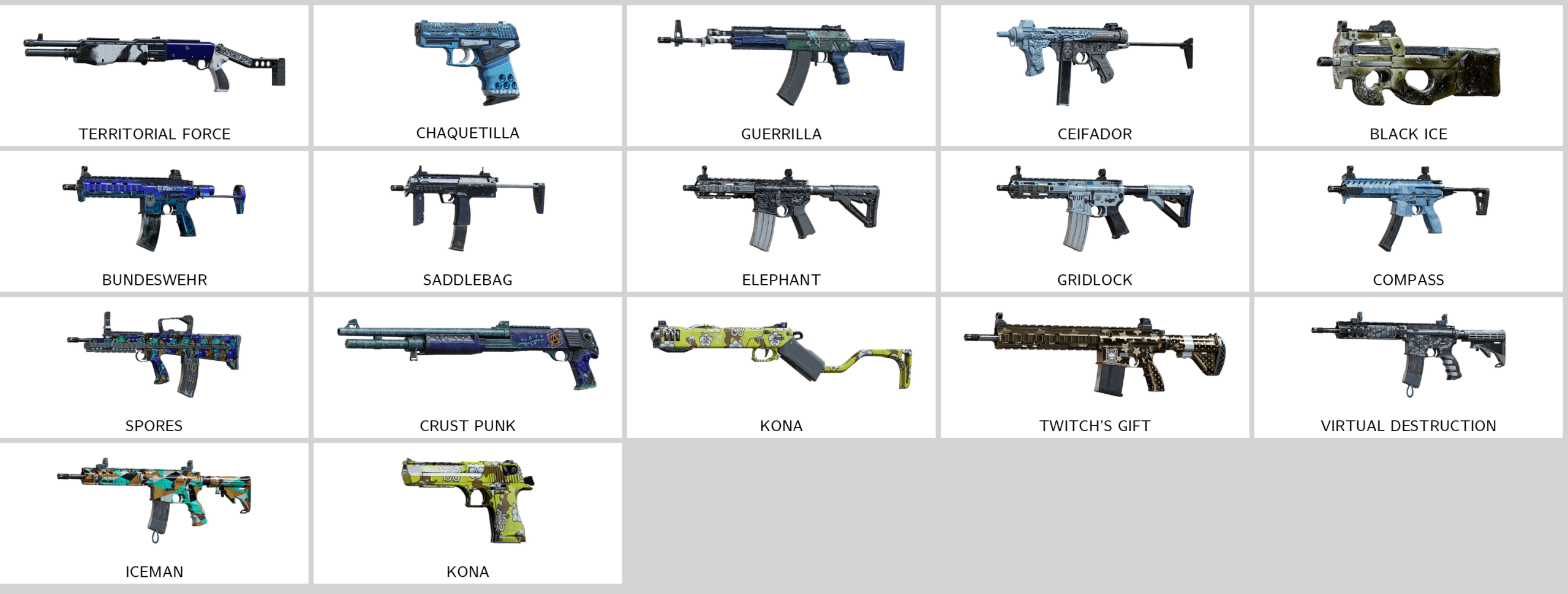 Some of Other Skins: New Notches (P226), Target (R4C), Vegvisir (D-50), Bundeswehr (416-C), Ceifador (M12), Devastating Might (M870), Venetian LMG (ALDA 5.56), Saddlebag (MP7)…