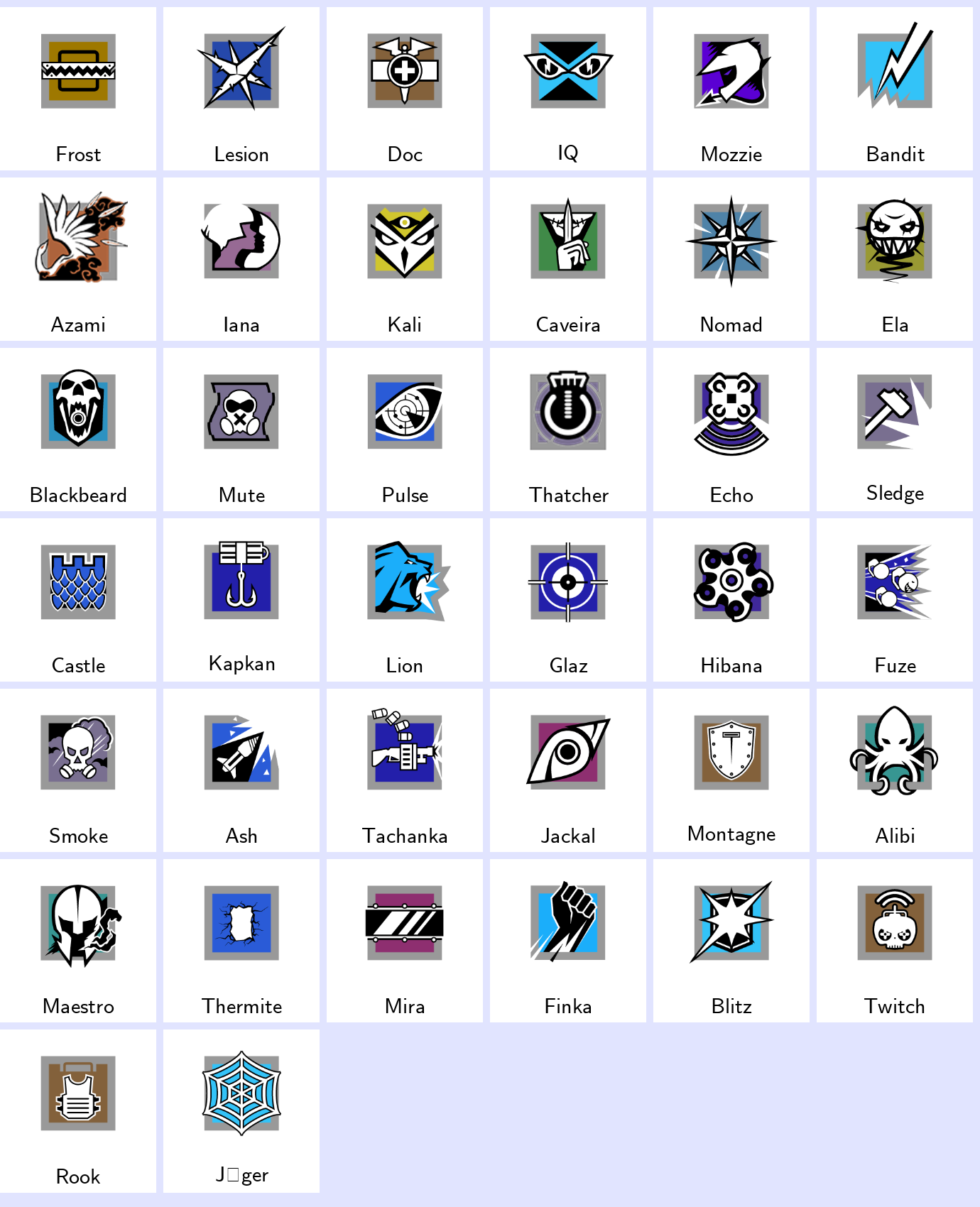 Some Operators: Frost, Lesion, Doc, Iq, Mozzie, Bandit, Azami, Iana, Kali, Caveira…