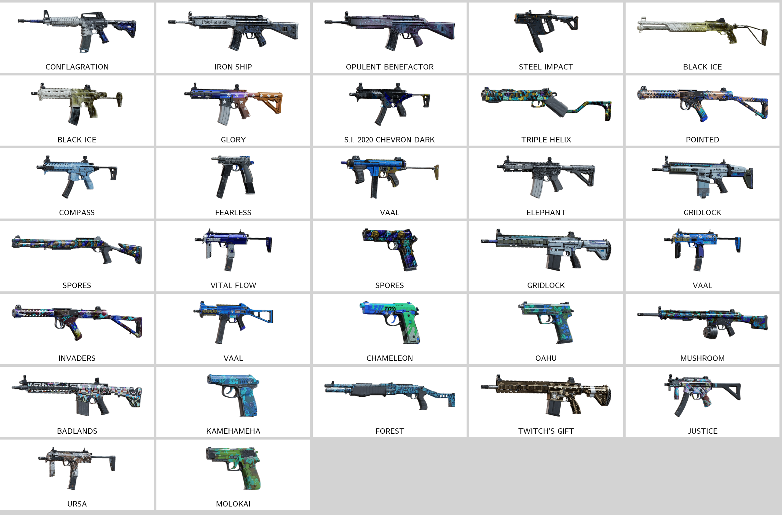 Some of Other Skins: Target (R4C), Olympus Shore (ITA12S), Opulent Benefactor (AR33), Steel Impact (Vector), Glory (R4C), Datum Processor (552 Commando), S.I. 2020 Chevron Dark (MPX), Iron Ship (AR33)…