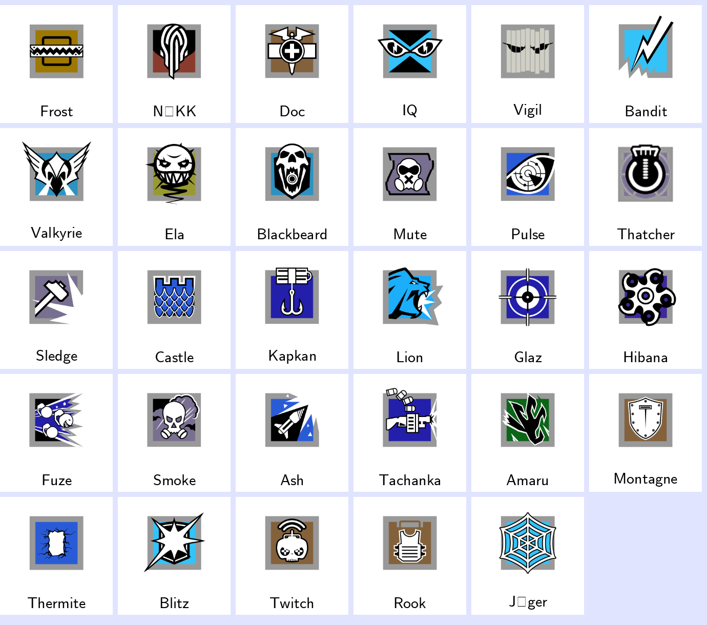 Some Operators: Frost, Nokk, Doc, Iq, Vigil, Bandit, Valkyrie, Ela, Blackbeard, Mute…