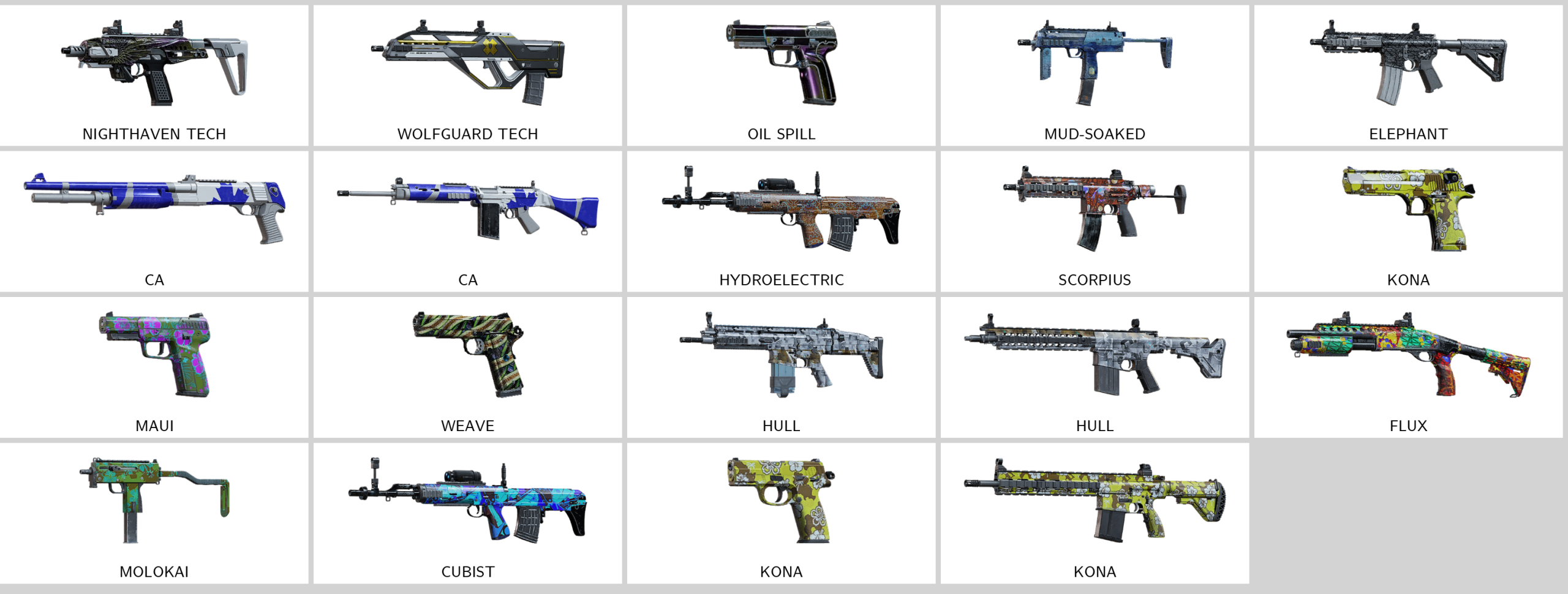 Some of Other Skins: Wolfguard Tech (Spear), Nighthaven Tech (P10 Roni), Leder (G8A1), Oil Spill (5.7 USG), Khokhloma (AK12), Glory (556XI), Woody (M590A1), Glory (G36C)…