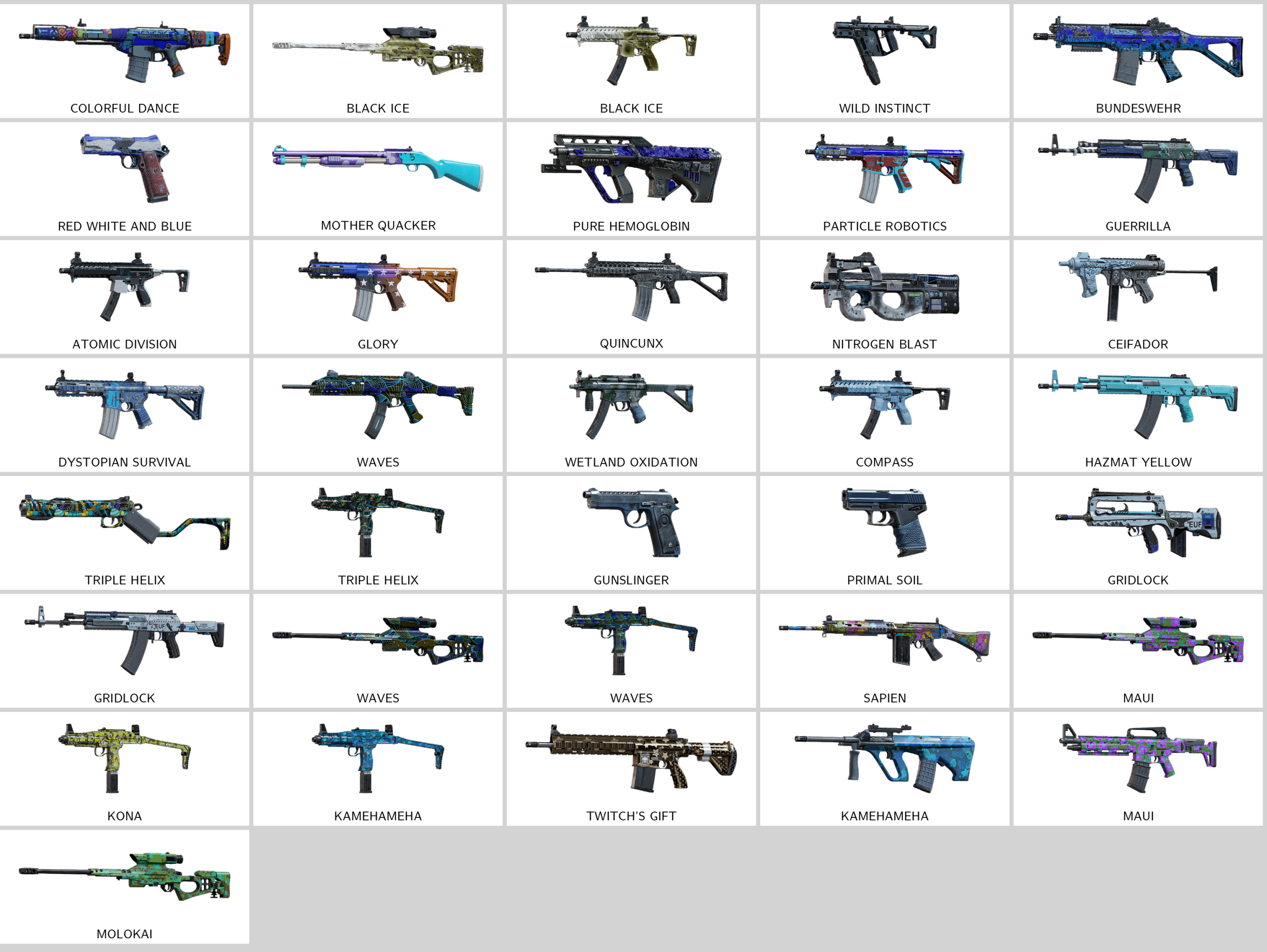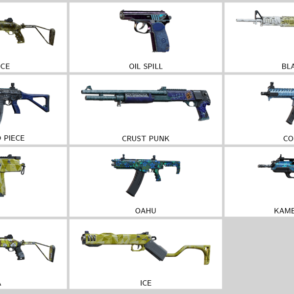 – Subatomic Beam (PDW9), Colorful Dance (ARX200), Flight of Triumph (M12), Scavenged Wonder (PARA-308), Dark Depths (L85A2), The Old Stock (L85A2)…