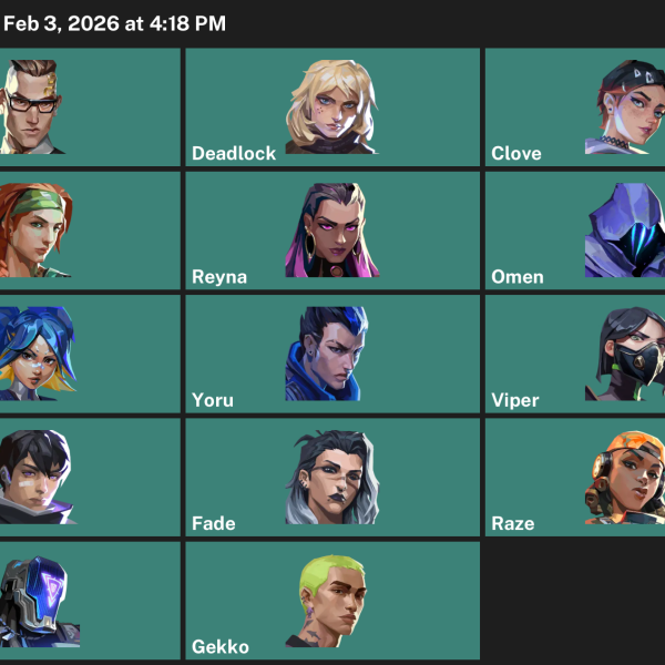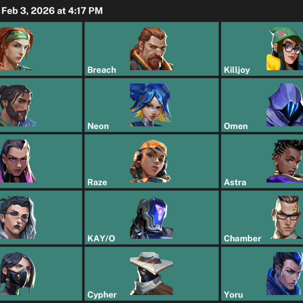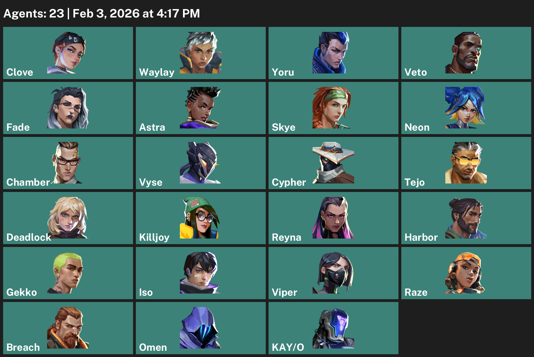 Clove, Waylay, Yoru, Fade, Astra, Skye, Neon, Chamber, Vyse, Cypher, Tejo, Deadlock, Killjoy, Reyna, Harbor, Gekko, Iso, Viper, Raze, Breach, Omen, KAY/O