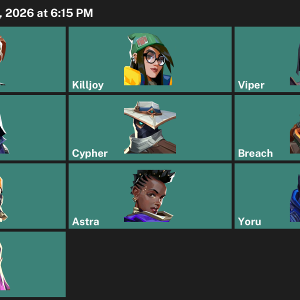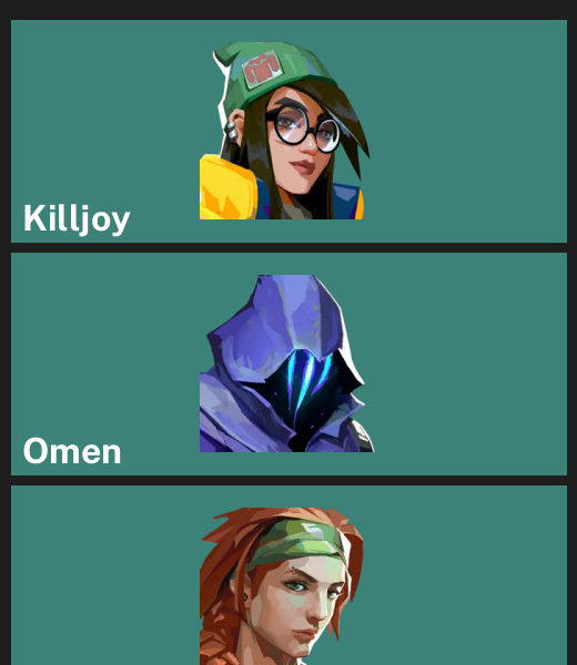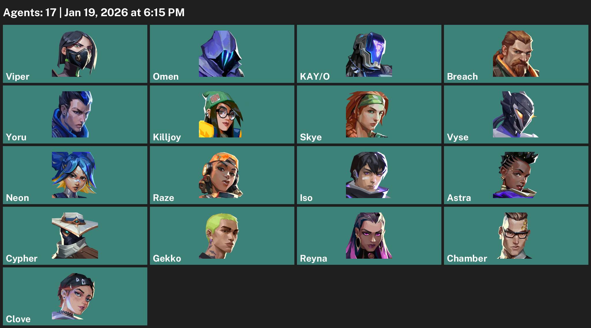 Viper, Omen, KAY/O, Breach, Yoru, Killjoy, Skye, Vyse, Neon, Raze, Iso, Astra, Cypher, Gekko, Reyna, Chamber, Clove