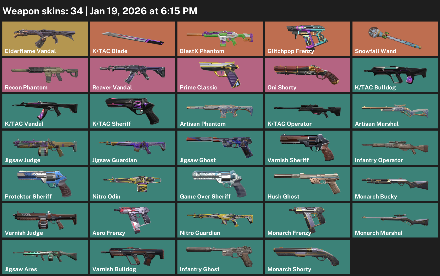 Elderflame Vandal, K/TAC Blade, BlastX Phantom, Glitchpop Frenzy, Snowfall Wand, Prime Classic, Oni Shorty, Artisan Marshal, Jigsaw Judge, Varnish Sheriff, Infantry Operator, Nitro Odin, Hush Ghost, Monarch Bucky