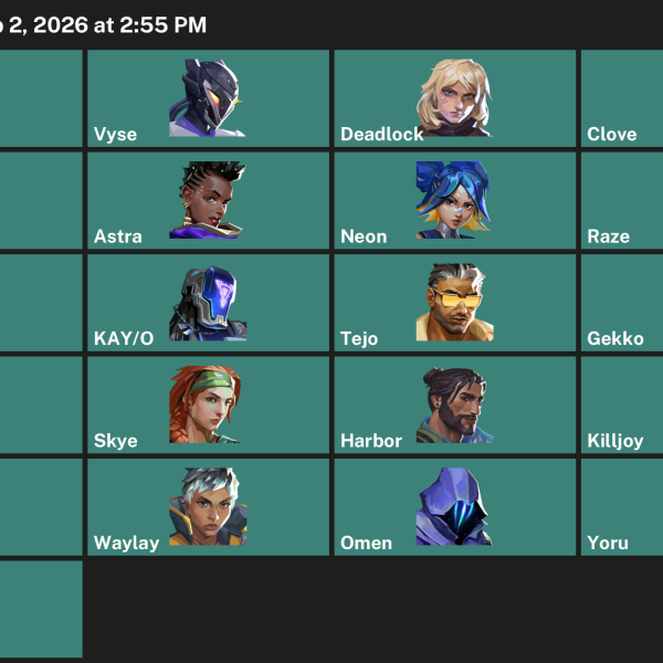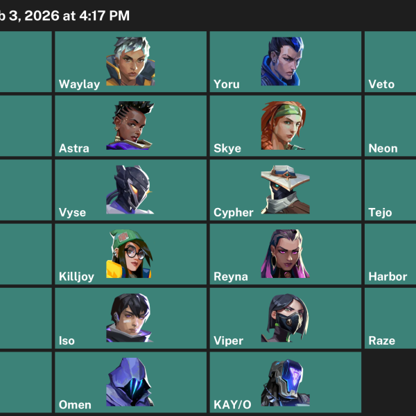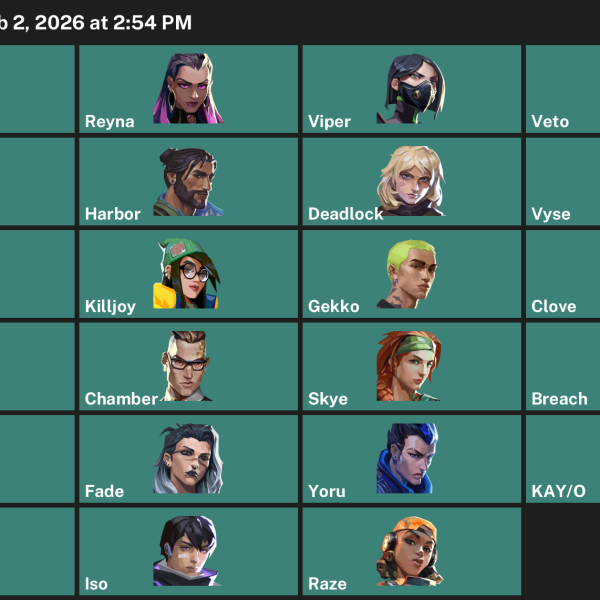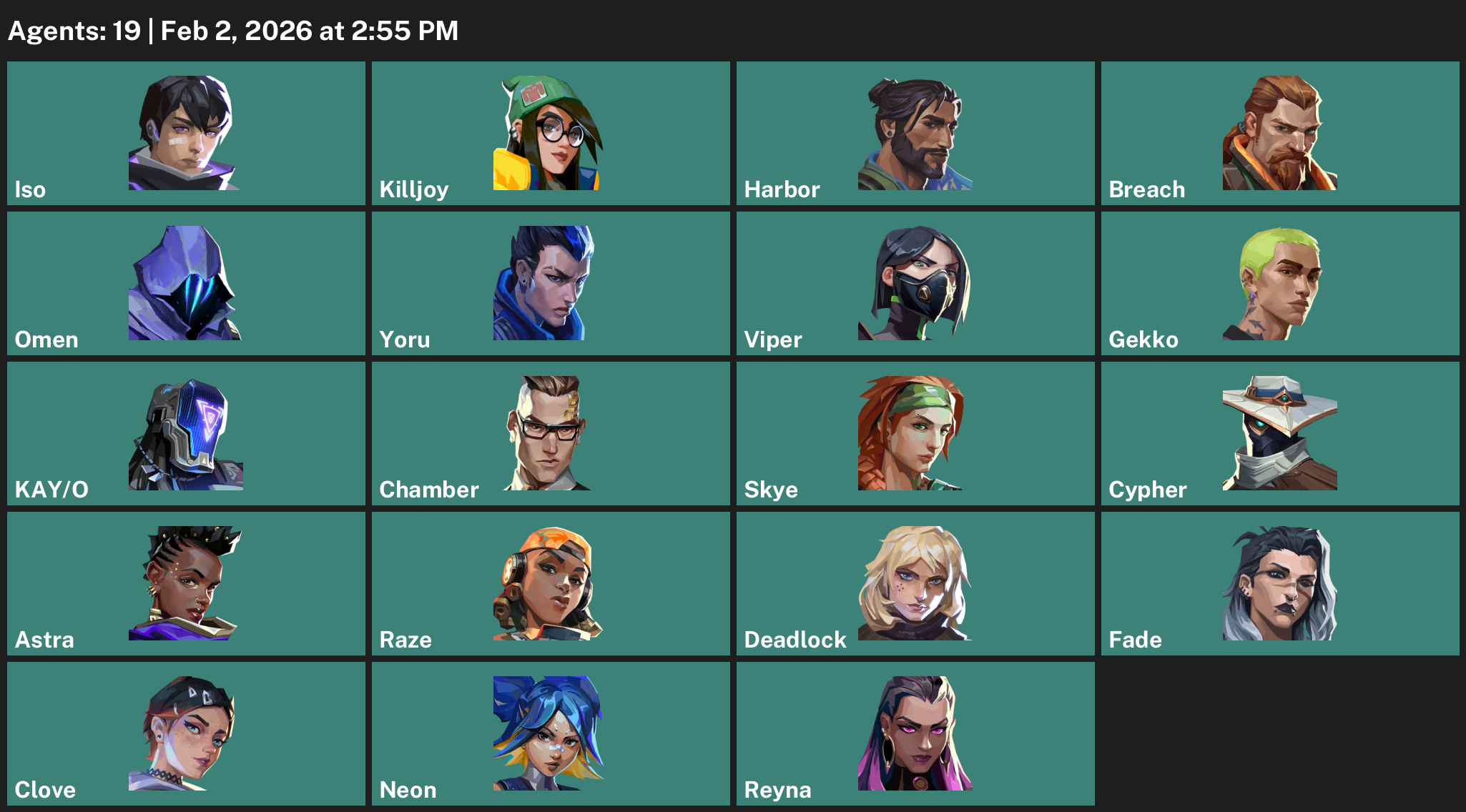 Iso, Killjoy, Harbor, Breach, Omen, Yoru, Viper, Gekko, KAY/O, Chamber, Skye, Cypher, Astra, Raze, Deadlock, Fade, Clove, Neon, Reyna