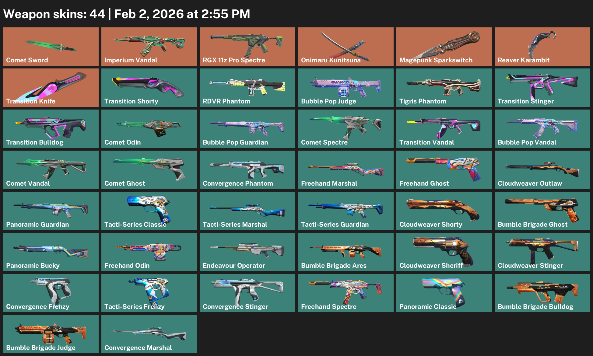 Comet Sword, Imperium Vandal, RGX 11z Pro Spectre, Onimaru Kunitsuna, Magepunk Sparkswitch, Reaver Karambit, Transition Knife, RDVR Phantom, Bubble Pop Judge, Freehand Marshal, Cloudweaver Outlaw, Panoramic Guardian