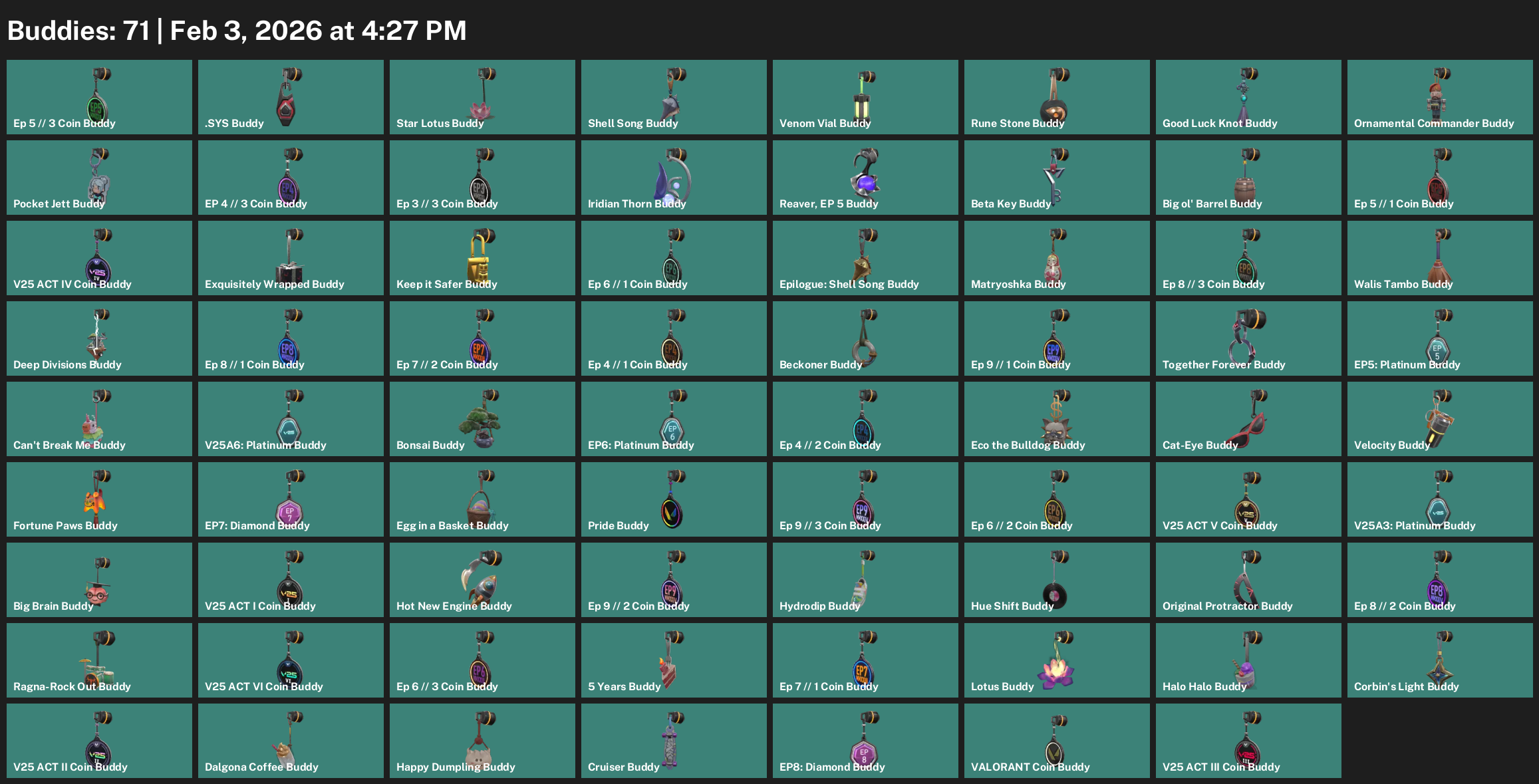 Reyna, Fade, Vyse, Waylay, Raze, Breach, Iso, Gekko, Chamber, Astra, Clove, Deadlock, Omen, Cypher, Yoru, Tejo, Viper, Harbor, KAY/O, Killjoy, Neon, Skye