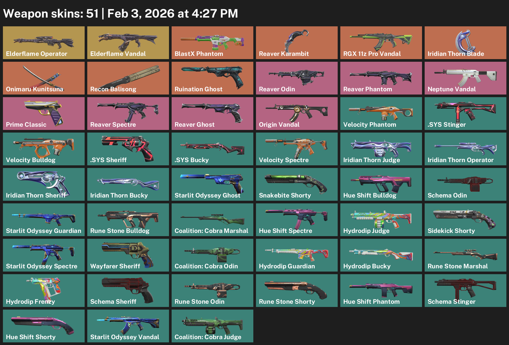 Elderflame Operator, BlastX Phantom, Reaver Karambit, RGX 11z Pro Vandal, Iridian Thorn Blade, Onimaru Kunitsuna, Recon Balisong, Ruination Ghost, Prime Classic, .SYS Stinger, Velocity Bulldog