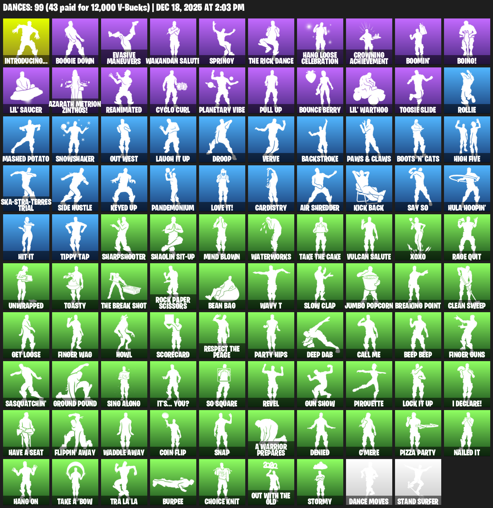 Introducing…, Boogie Down, Evasive Maneuvers, Wakandan Salute, Springy, Hang Loose Celebration, Crowning Achievement, Boomin’, Boing!, Lil’ Saucer, Azarath Metrion Zinthos!, Reanimated, Cyclo Curl, Planetary Vibe, Pull Up, Bounce Berry, Toosie Slide, Rollie