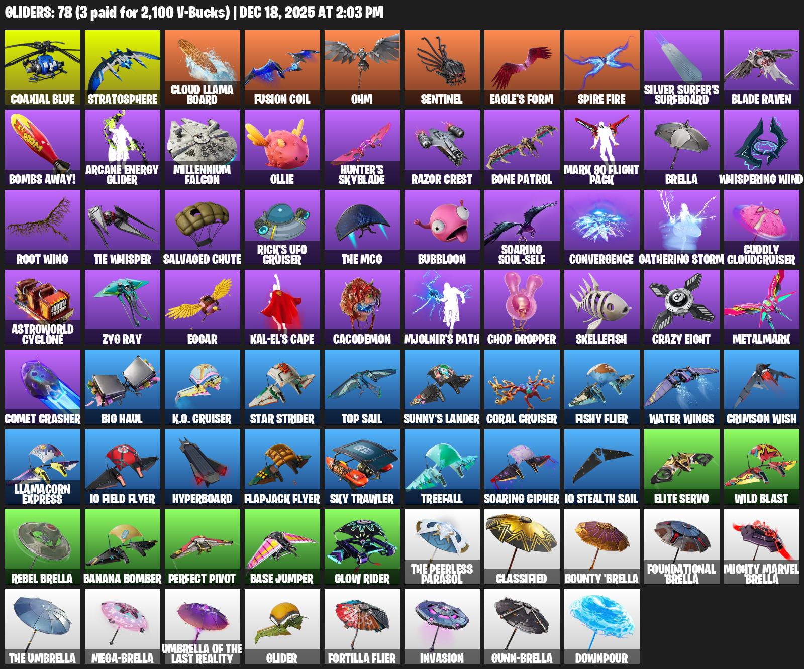 Coaxial Blue, Stratosphere, Ohm, Sentinel, Eagle’s Form, Silver Surfer’s Surfboard, Blade Raven, Bombs Away!, Arcane Energy Glider, Millennium Falcon, Ollie, Hunter’s Skyblade, Razor Crest, Bone Patrol, Mark 90 Flight Pack, Brella, Whispering Wind