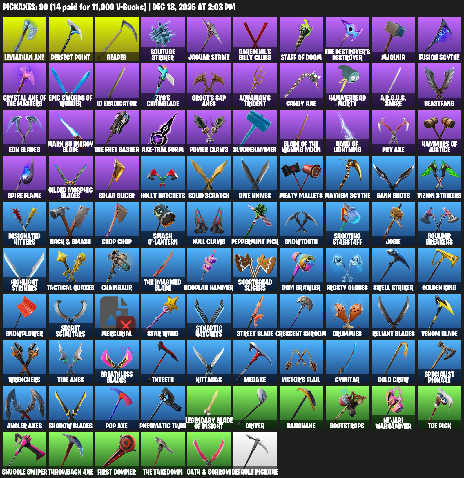 Leviathan Axe, Reaper, Jaguar Strike, Daredevil’s Billy Clubs, Staff of Doom, The Destroyer’s Destroyer, Mjolnir, IO Eradicator, Zyg’s Chainblade, Groot’s Sap Axes, Aquaman’s Trident, Hammerhead Morty, A.R.G.U.S. Sabre, Beastfang