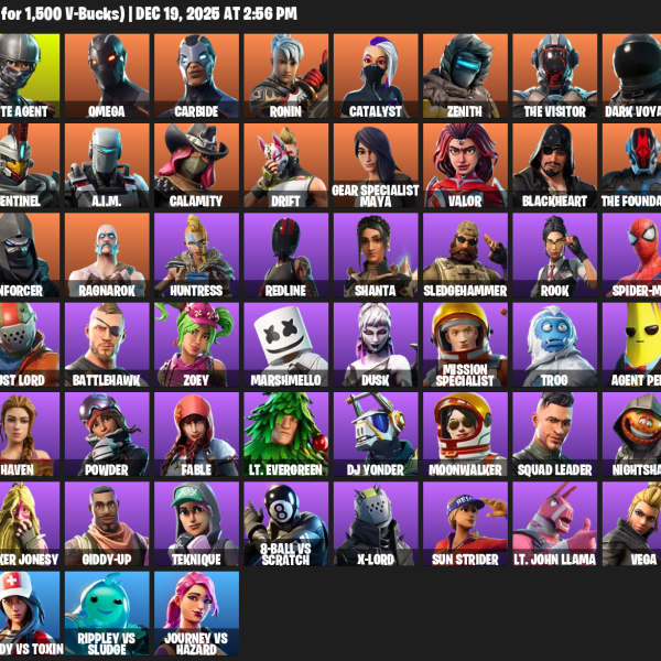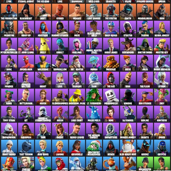 Point Patroller, Gear Specialist Maya, Lara Croft, Sultura, Fixer, Cloud Striker, Neo Versa, Breakpoint, Trilogy, Blizzard Bomber, Midas, Fade, Eternal Knight, Mandalorian, Raz, Spire Assassin, Kymera, Fusion, Menace, Deadpool