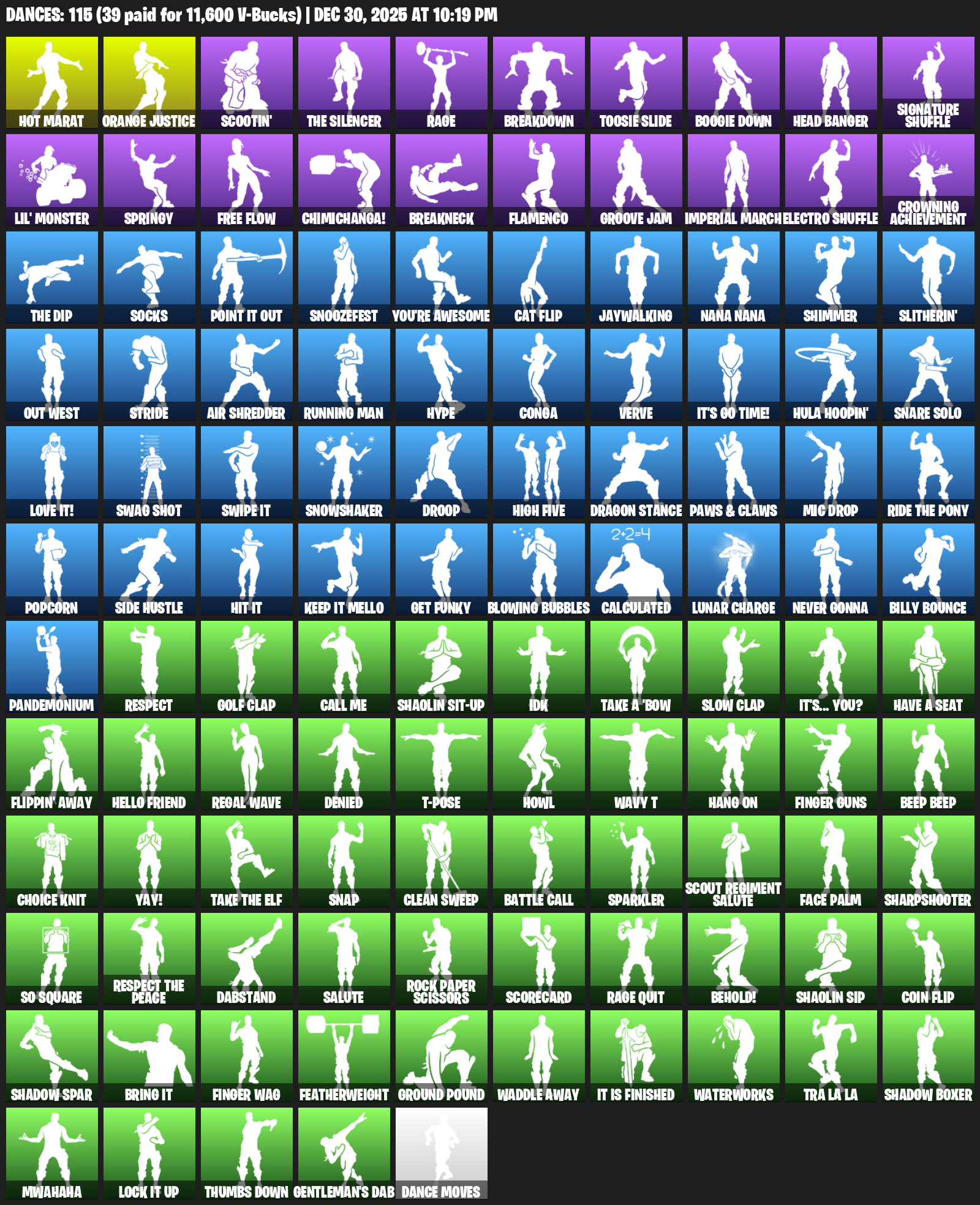 Hot Marat, Orange Justice, Scootin’, Rage, Breakdown, Toosie Slide, Boogie Down, Head Banger, Signature Shuffle, Lil’ Monster, Springy, Free Flow, Chimichanga!, Breakneck, Flamenco, Groove Jam, Imperial March, Crowning Achievement