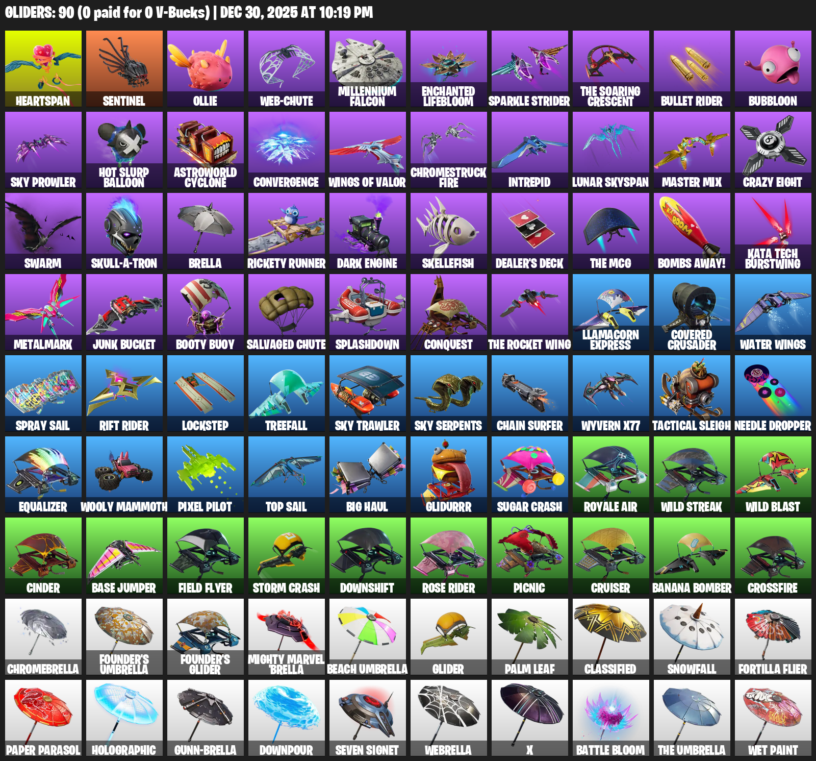 Heartspan, Sentinel, Ollie, Web-Chute, Millennium Falcon, Enchanted Lifebloom, Sparkle Strider, Bullet Rider, Bubbloon, Sky Prowler, Astroworld Cyclone, Convergence, Chromestruck Fire, Intrepid, Lunar Skyspan, Master Mix, Crazy Eight