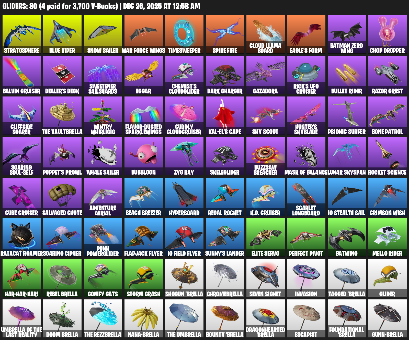 Stratosphere, Blue Viper, Snow Sailer, Timesweeper, Cloud Llama Board, Eagle’s Form, Batman Zero Wing, Chop Dropper, Balvin Cruiser, Dealer’s Deck, Sweetener Sailshards, Eggar, Chemist’s Cloudglider, Dark Charger, Cazadora, Bullet Rider, Razor Crest