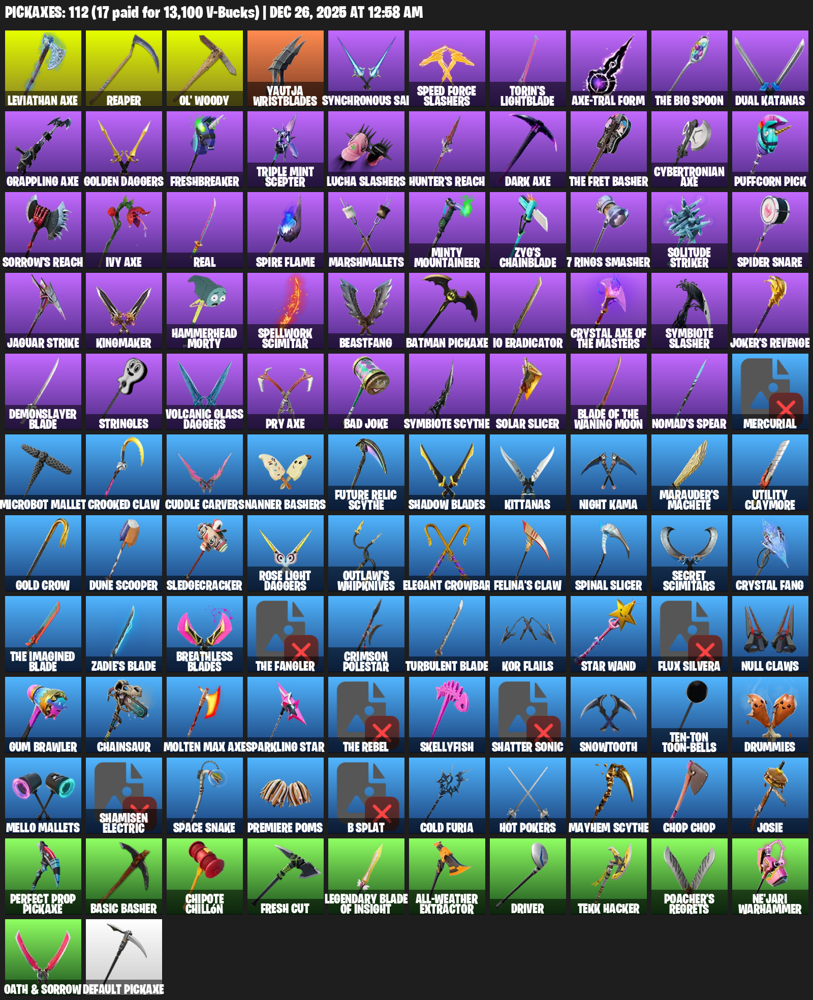 Leviathan Axe, Reaper, Ol’ Woody, Yautja Wristblades, Synchronous Sai, Speed Force Slashers, Torin’s Lightblade, The Big Spoon, Dual Katanas, Golden Daggers, Freshbreaker, Triple Mint Scepter, Hunter’s Reach, Puffcorn Pick