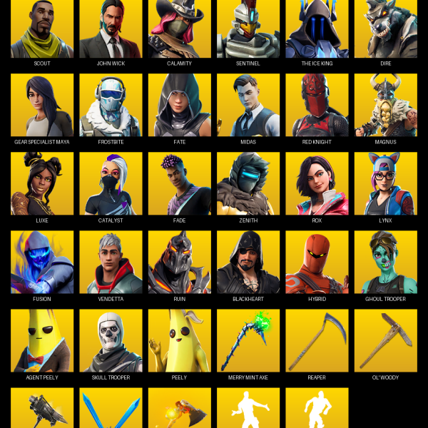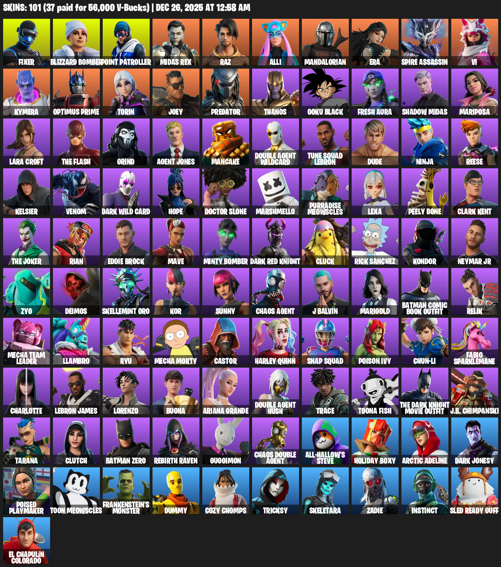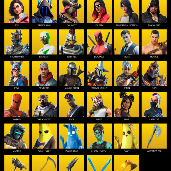 Point Patroller, Lara Croft, Fixer, Blizzard Bomber, Midas Rex, Raz, Alli, Mandalorian, Era, Spire Assassin, Vi, Kymera, Optimus Prime, Torin, Joey, Predator, Thanos, Goku Black, Fresh Aura