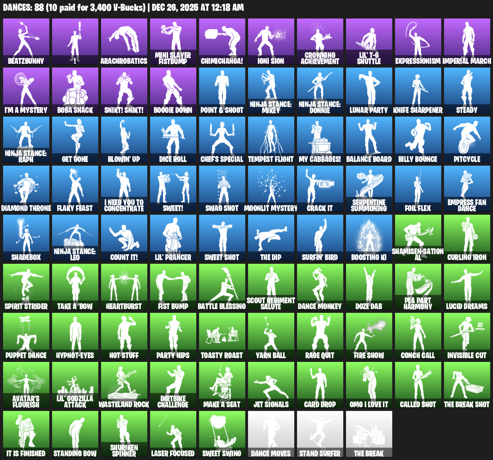 BeatzBunny, !, Arachrobatics, Mini Slayer Fistbump, Chimichanga!, Igni Sign, Crowning Achievement, Lil’ T-6 Shuttle, Expressionism, Imperial March, I’m a Mystery, Boba Snack, Snikt! Snikt!, Boogie Down, Point & Shoot, Ninja Stance: Mikey, Lunar Party, Knife Sharpener, Steady